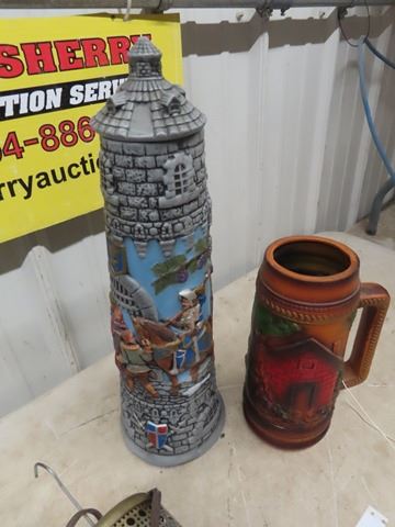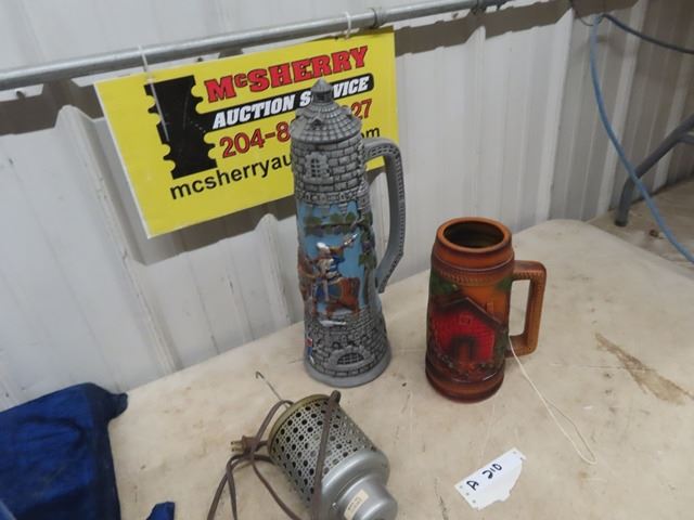 2 Large Steins, Tallest is 19", & Retro Hanging Heater