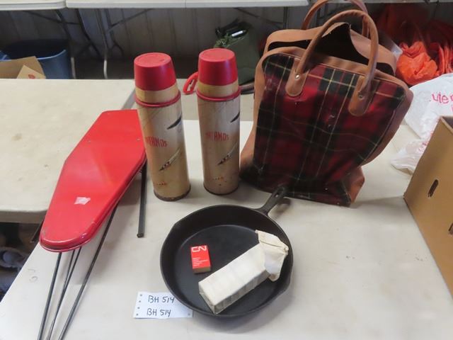 2 Large Thermos- Fishing Theme, Plaid Bag, Small Ironing Board, Cast Frying Pan, CN Matches