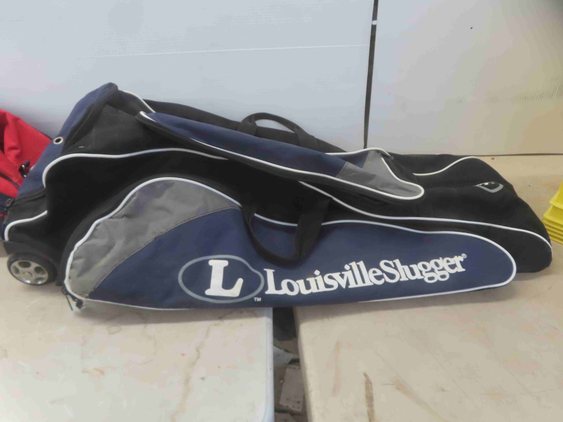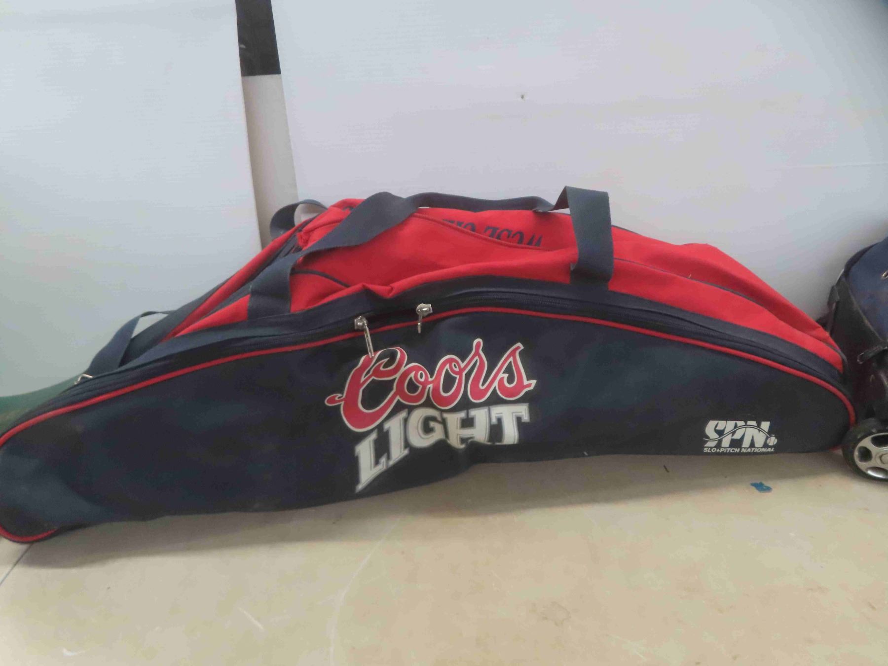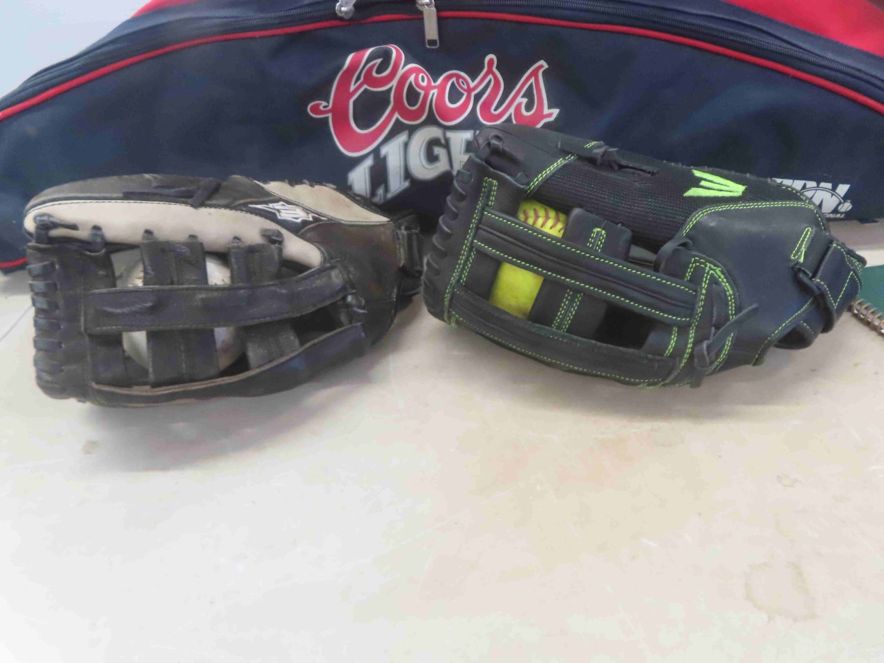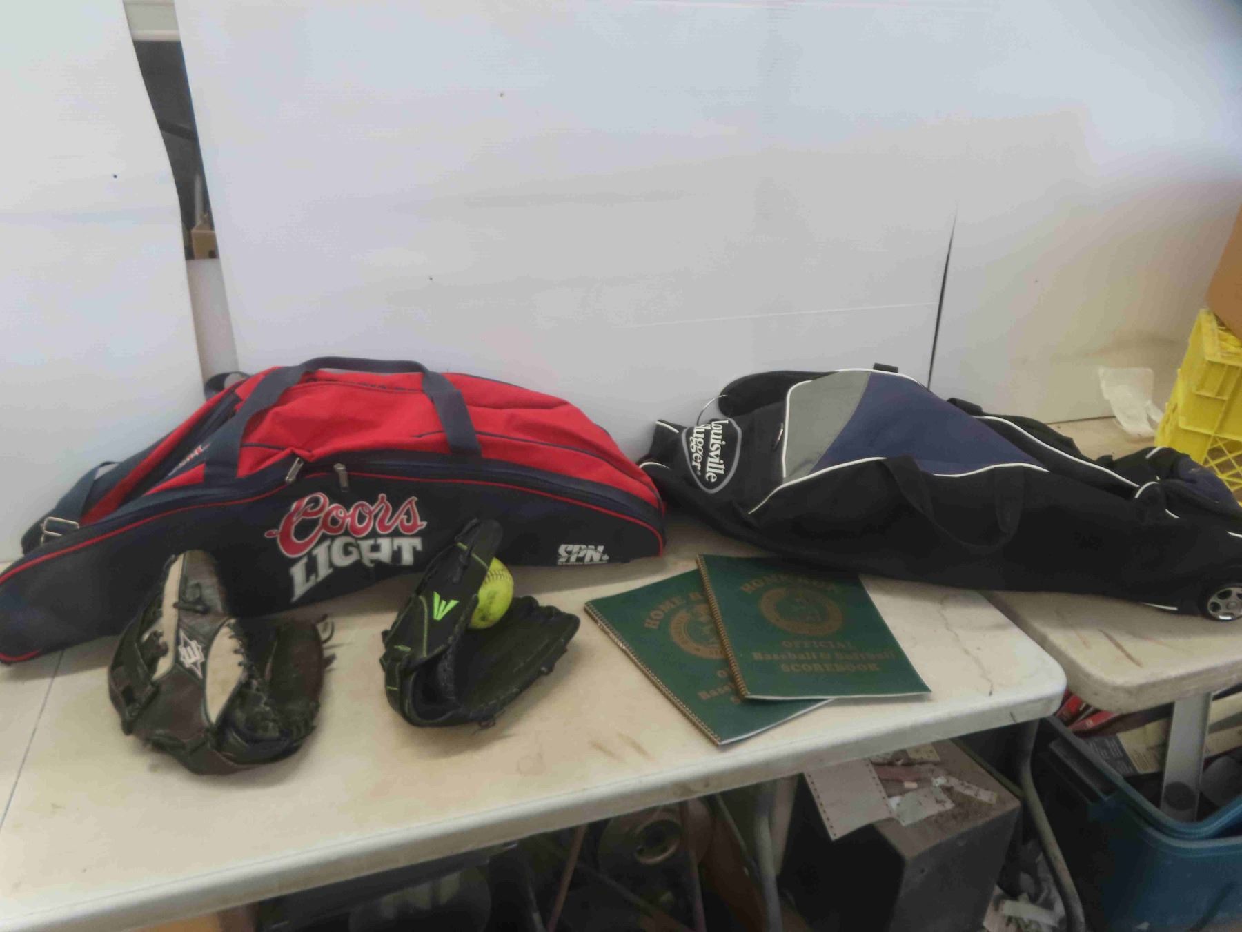 2 Left Handed Baseball Gloves, Balls , 2 Score Books , 2 Equipment Bags (Zipper Broken on Red Bag)