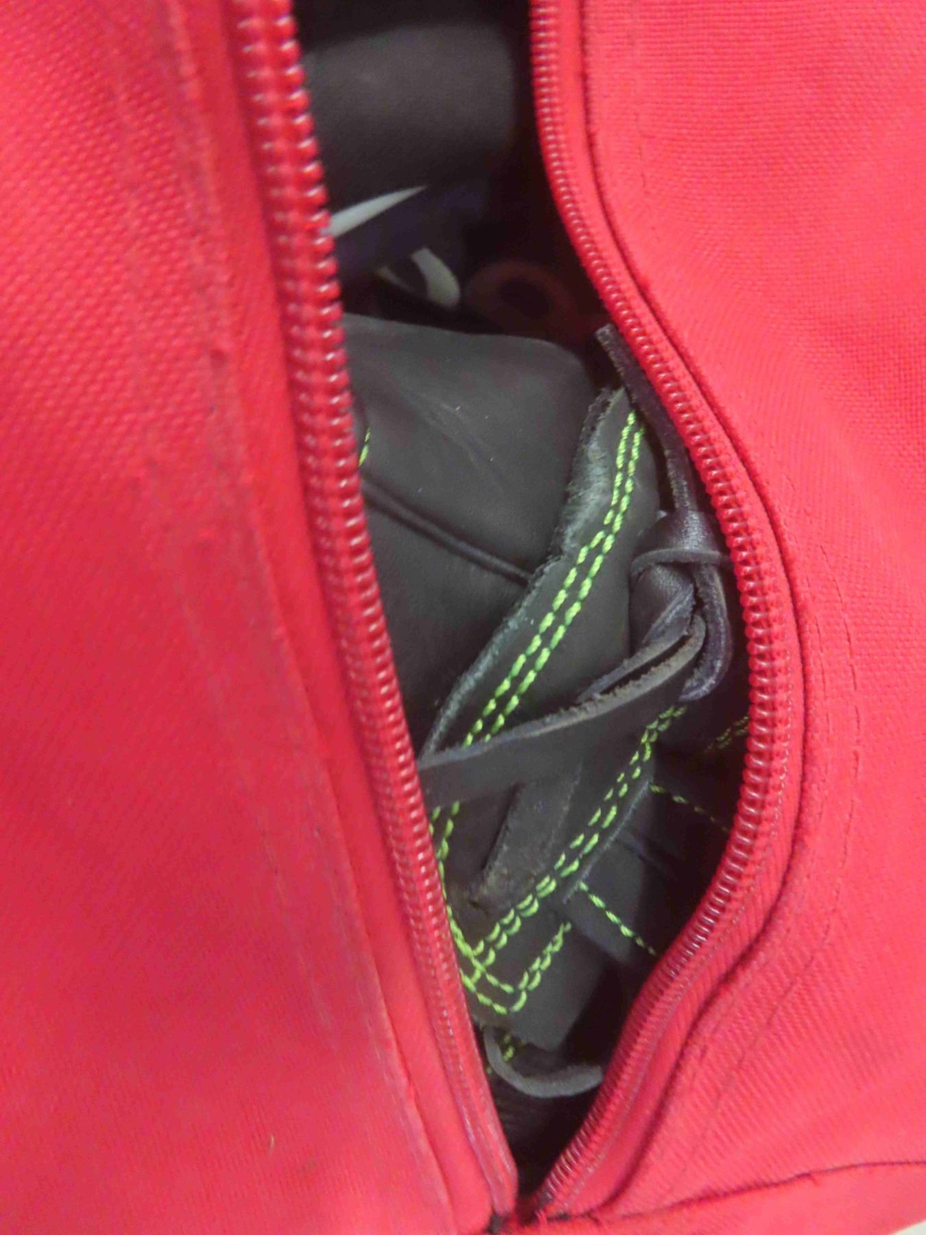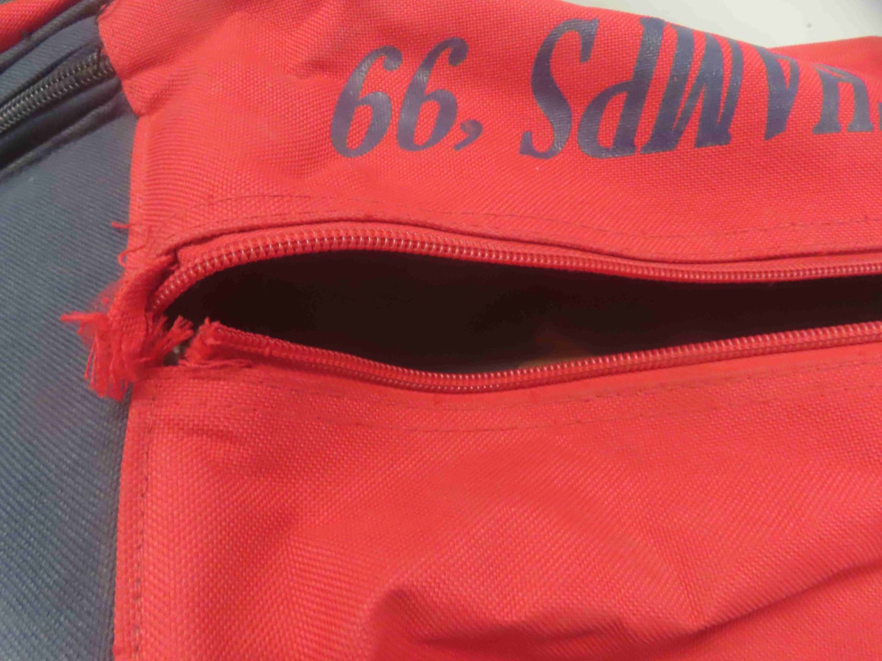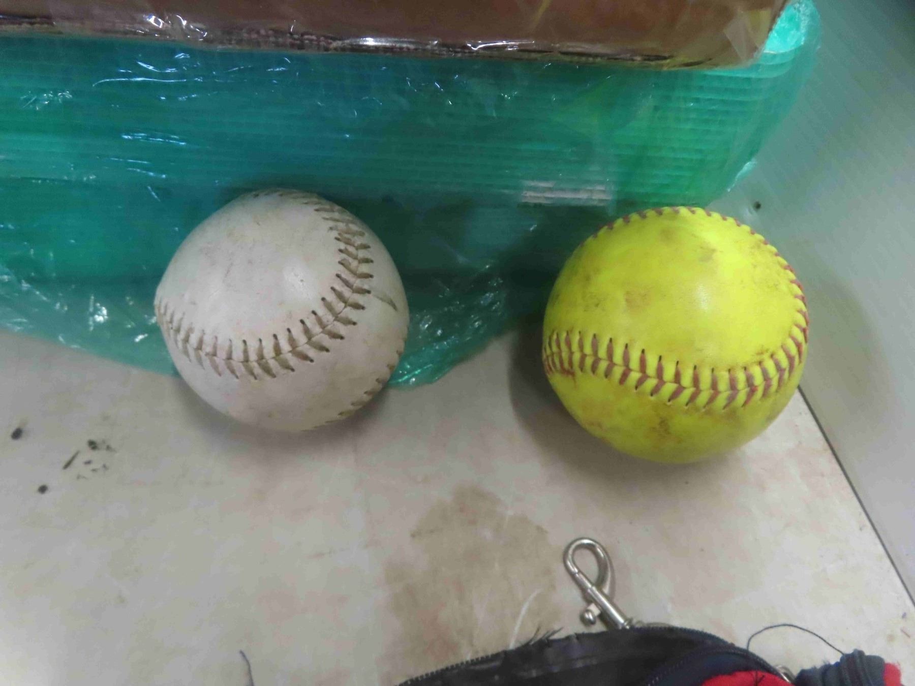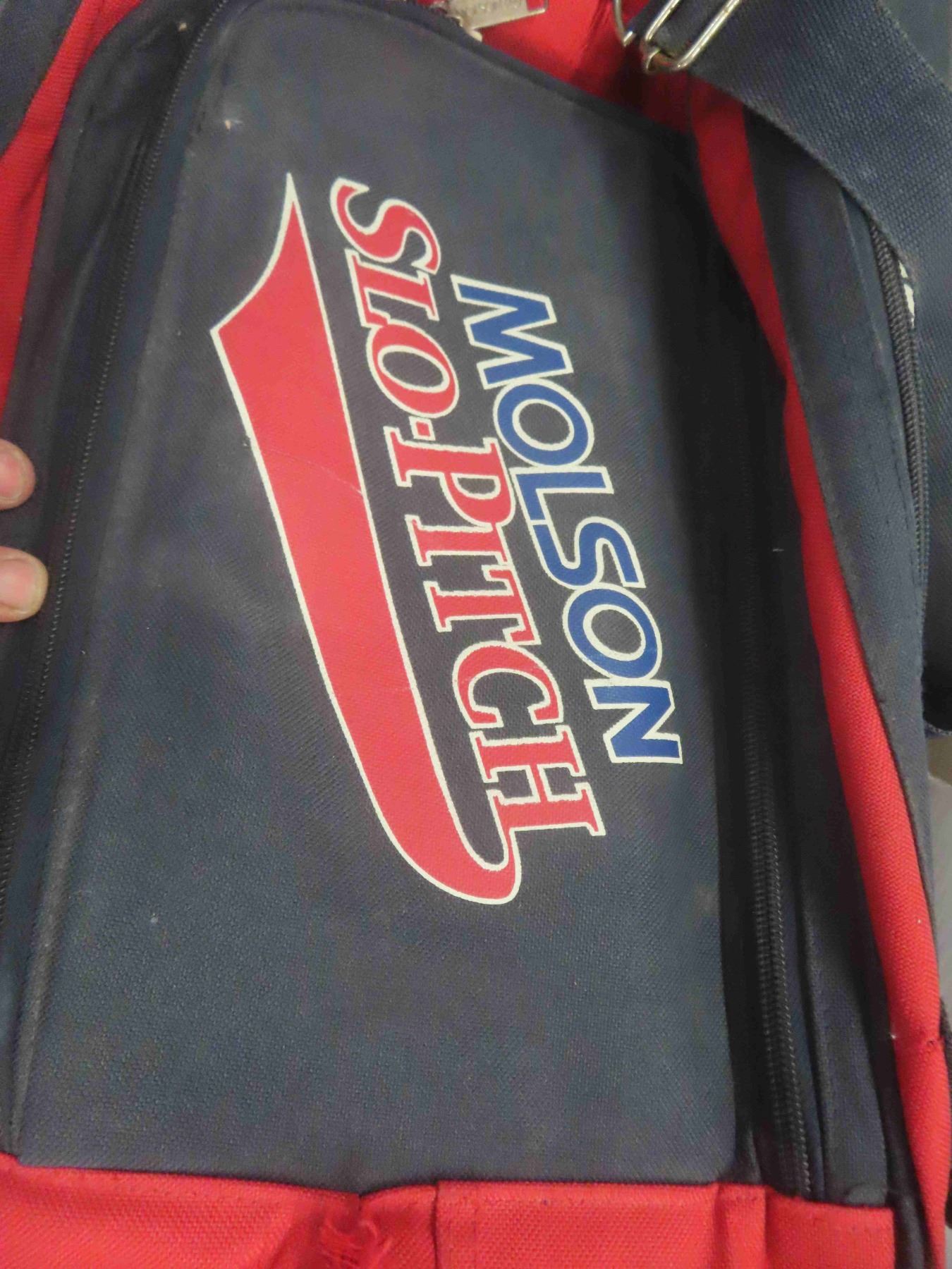 2 Left Handed Baseball Gloves, Balls , 2 Score Books , 2 Equipment Bags (Zipper Broken on Red Bag)