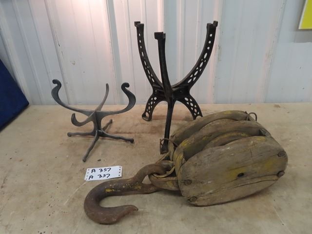 2 Metal Stands (repurpose) & Large Wood Pulley