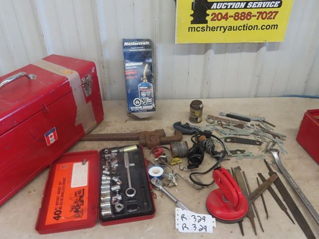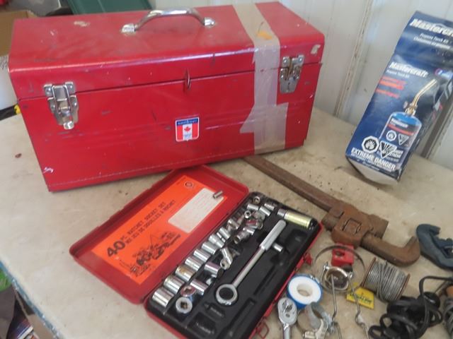 2 Metal Tool Boxes, 3/8" Socket Set, Propane Torch Kit, Soldering Gun, Filter Wrench, Pipe Cutter plus more