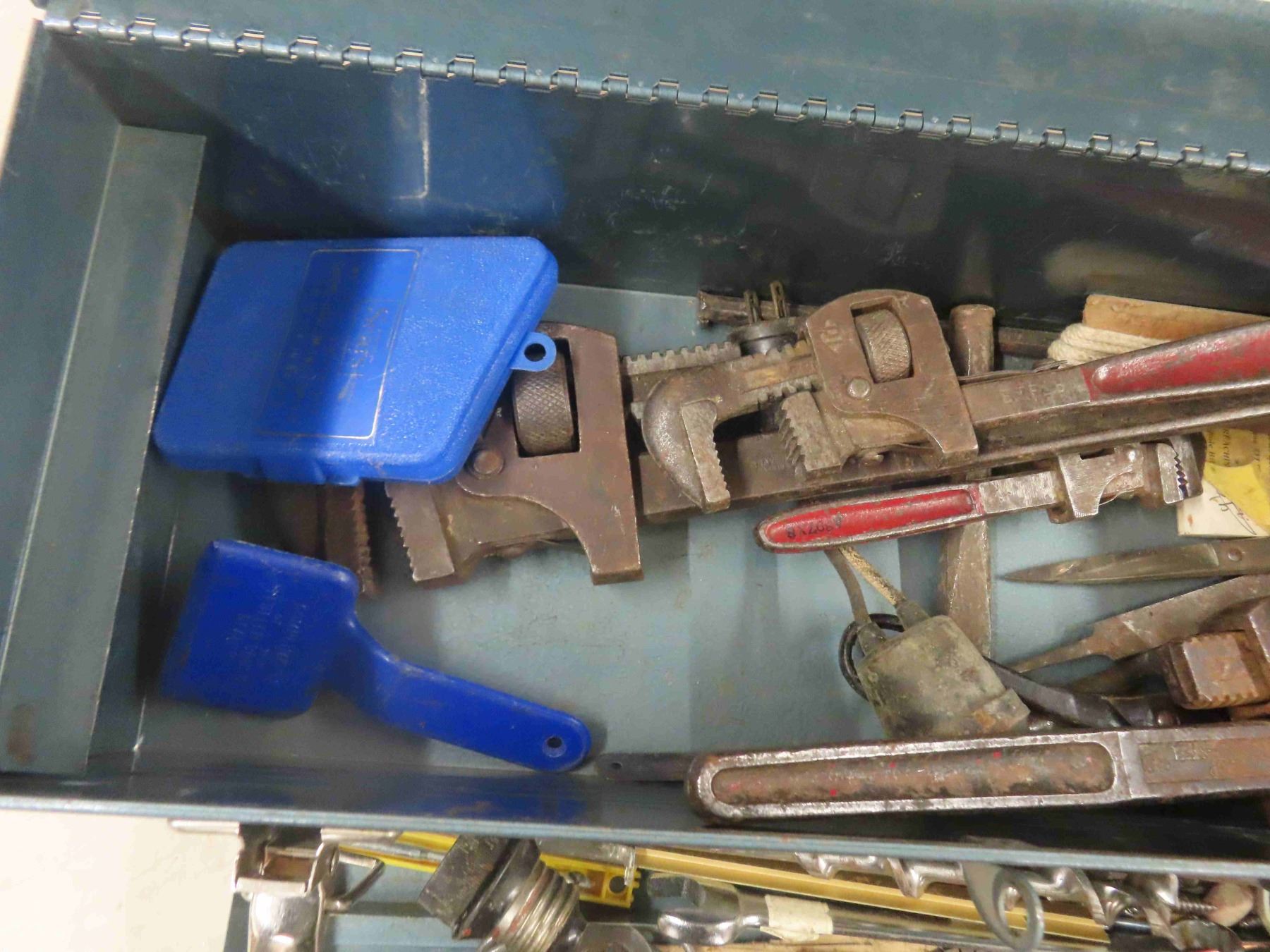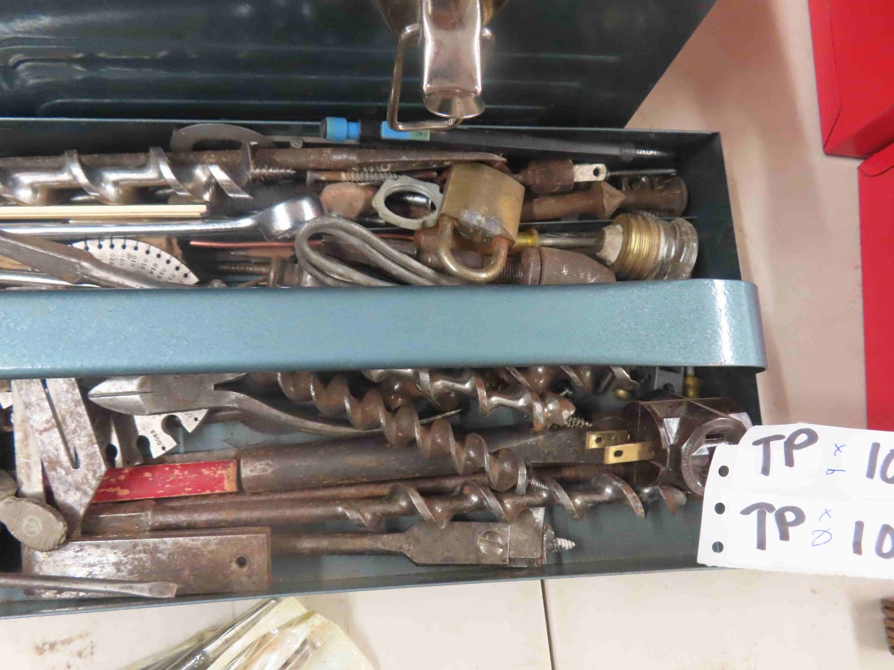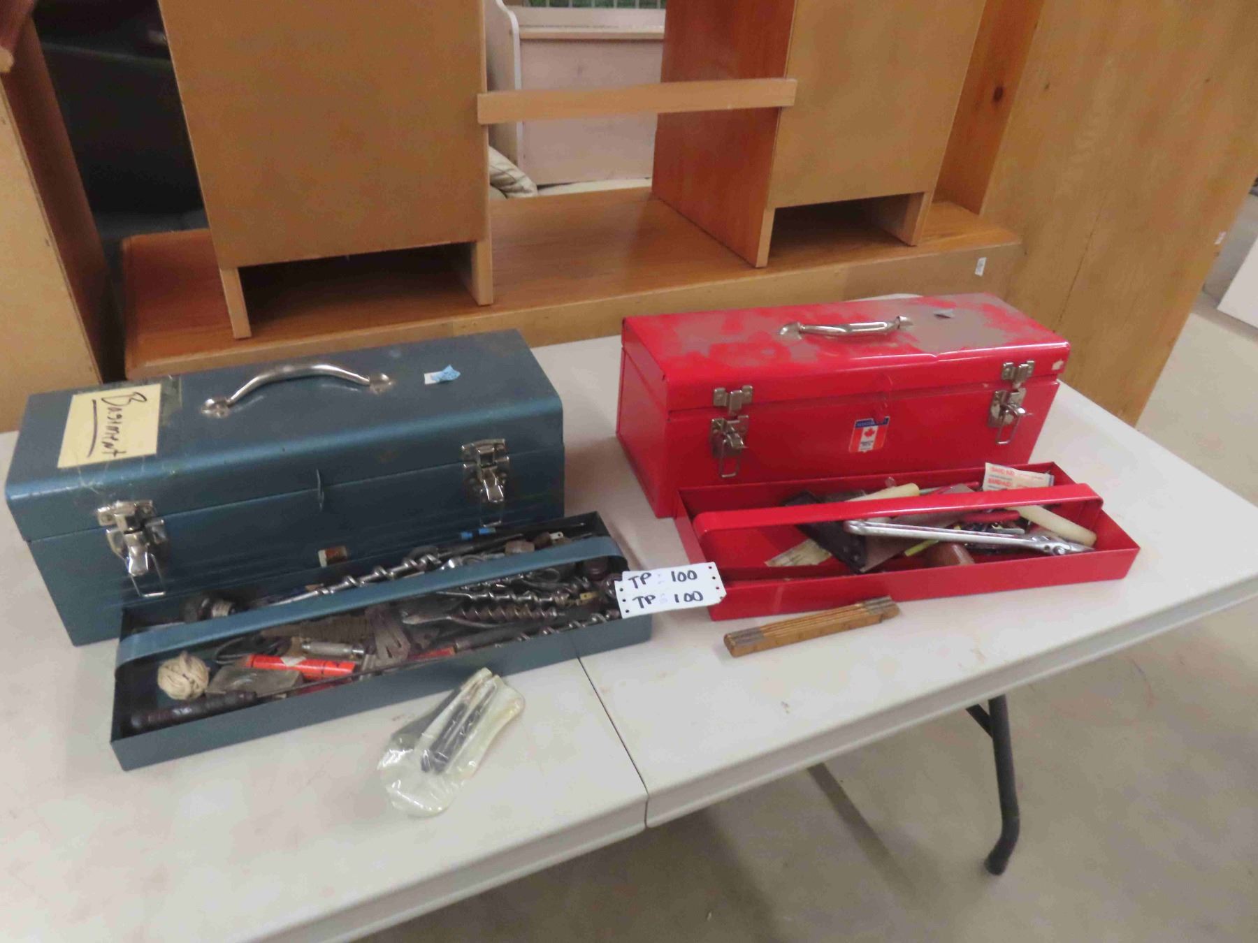 2 Metal Tool Boxes with Odds n Ends of Tools - Modern + Antique ; Drill Bits, Pipe Wrench, Hack Saw, Crescent Wrench, Folding Ruler, Punch, Chisel