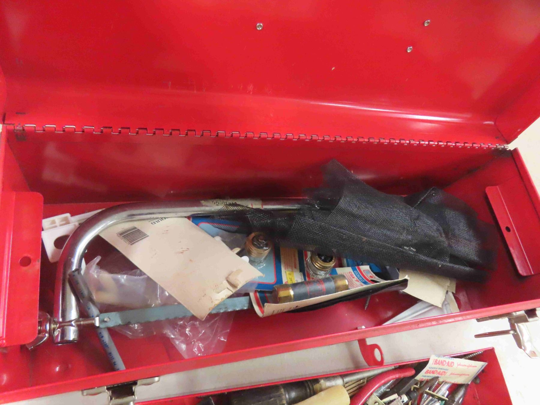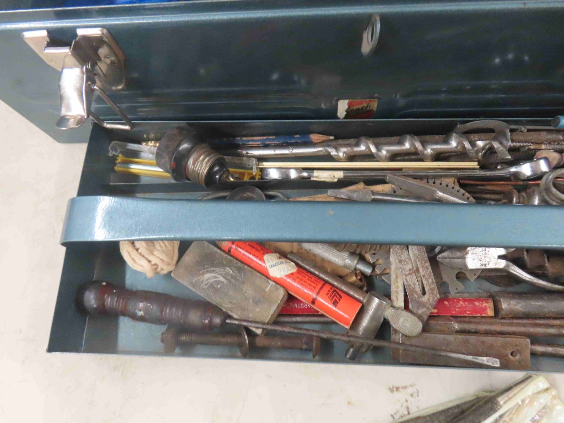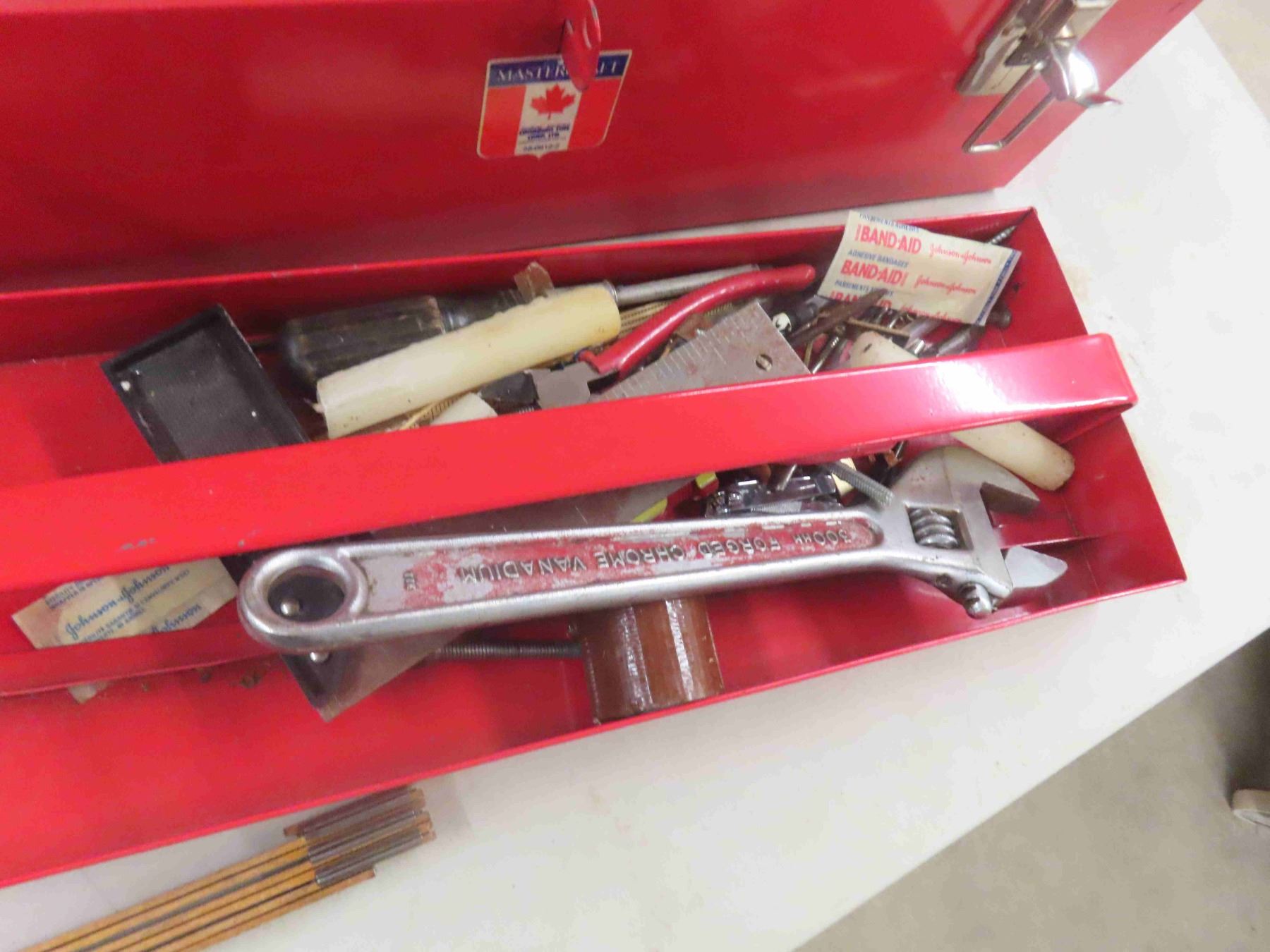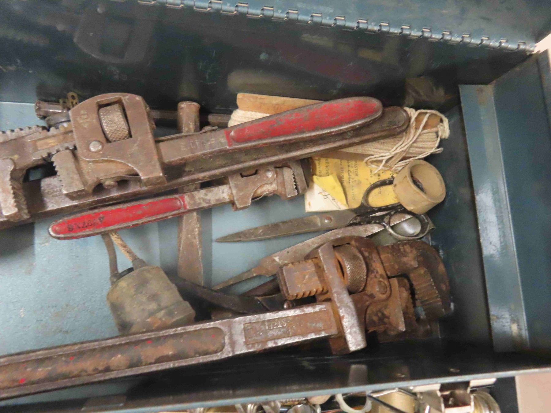 2 Metal Tool Boxes with Odds n Ends of Tools - Modern + Antique ; Drill Bits, Pipe Wrench, Hack Saw, Crescent Wrench, Folding Ruler, Punch, Chisel