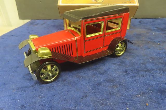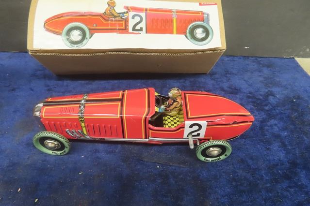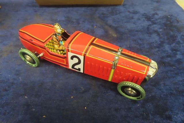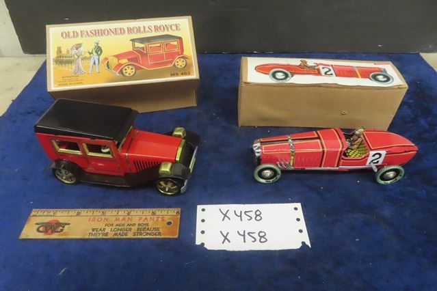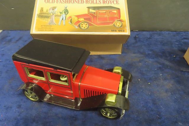 2 Modern Pressed Tin Tags ; Old Fashion Rolls Royce + Race Car - Both Wind Up Made in China- New in Box
