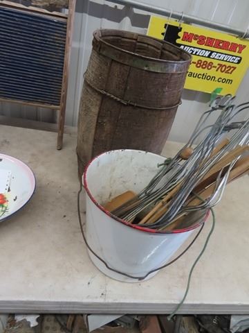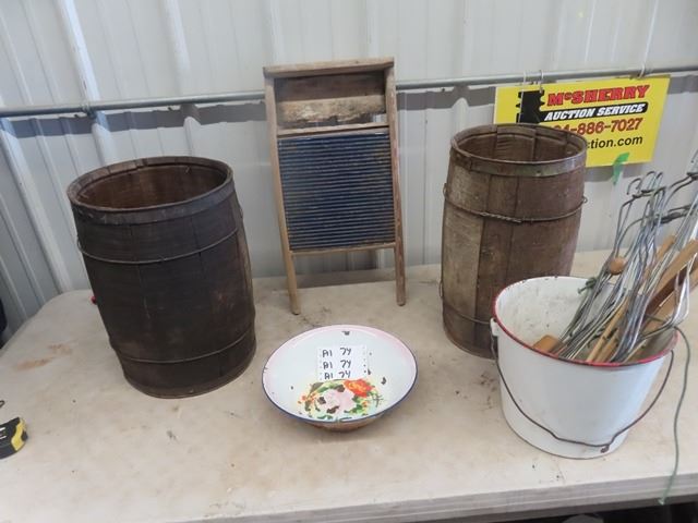 2 Nail Kegs, Washboard, Enamelware, & Sock Stretchers
