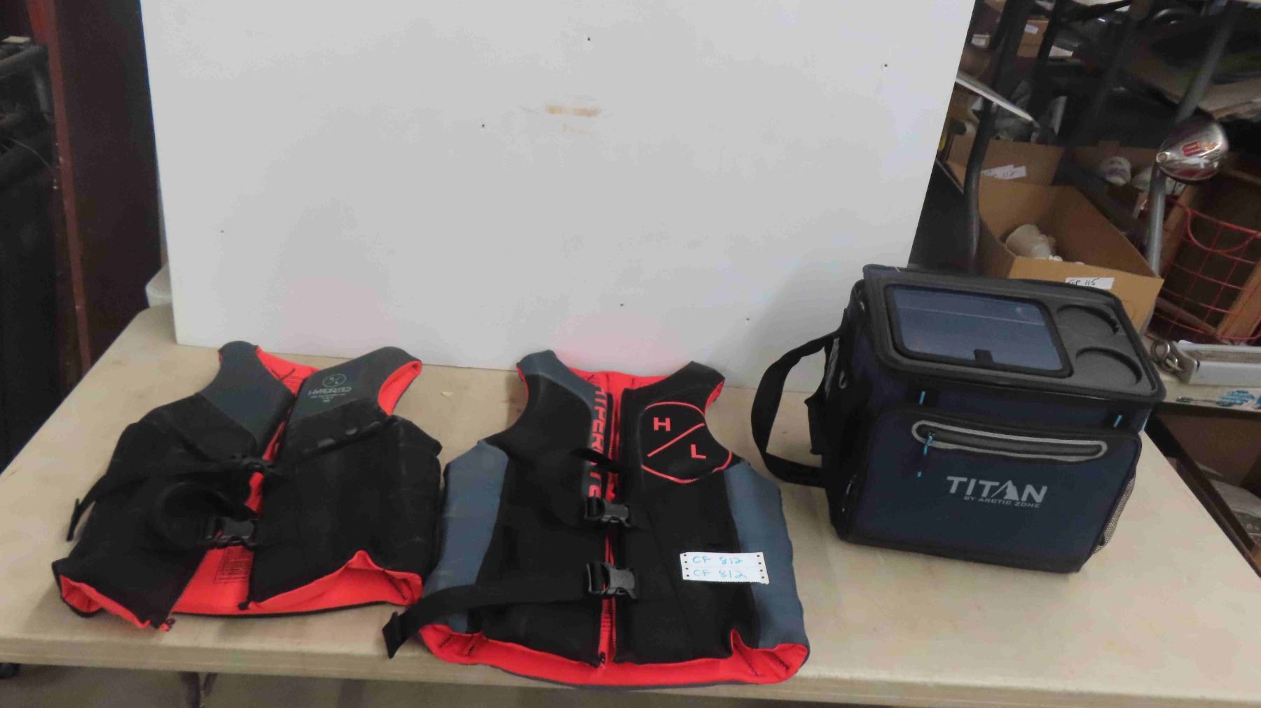 2 New Hyperlite Life Jackets Adult Size Large & Medium , Titan Artic Cooler