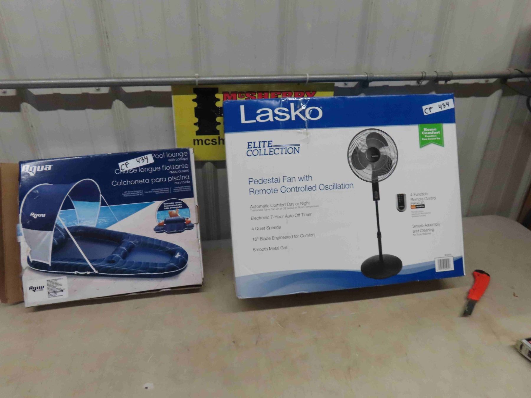 2 New Items ; Aqua Pool Floating Lounger with Canopy & Lasko Pedestal Fan with Remote - 16" Blade