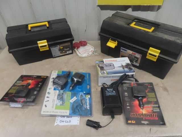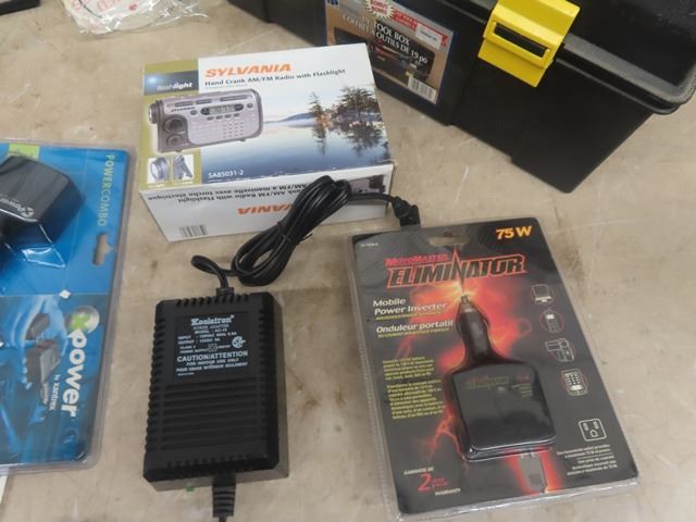 2 New Plastic Tool Boxes, 2 Eliminator Power Invertors, Hand Crank Radio - All New Product