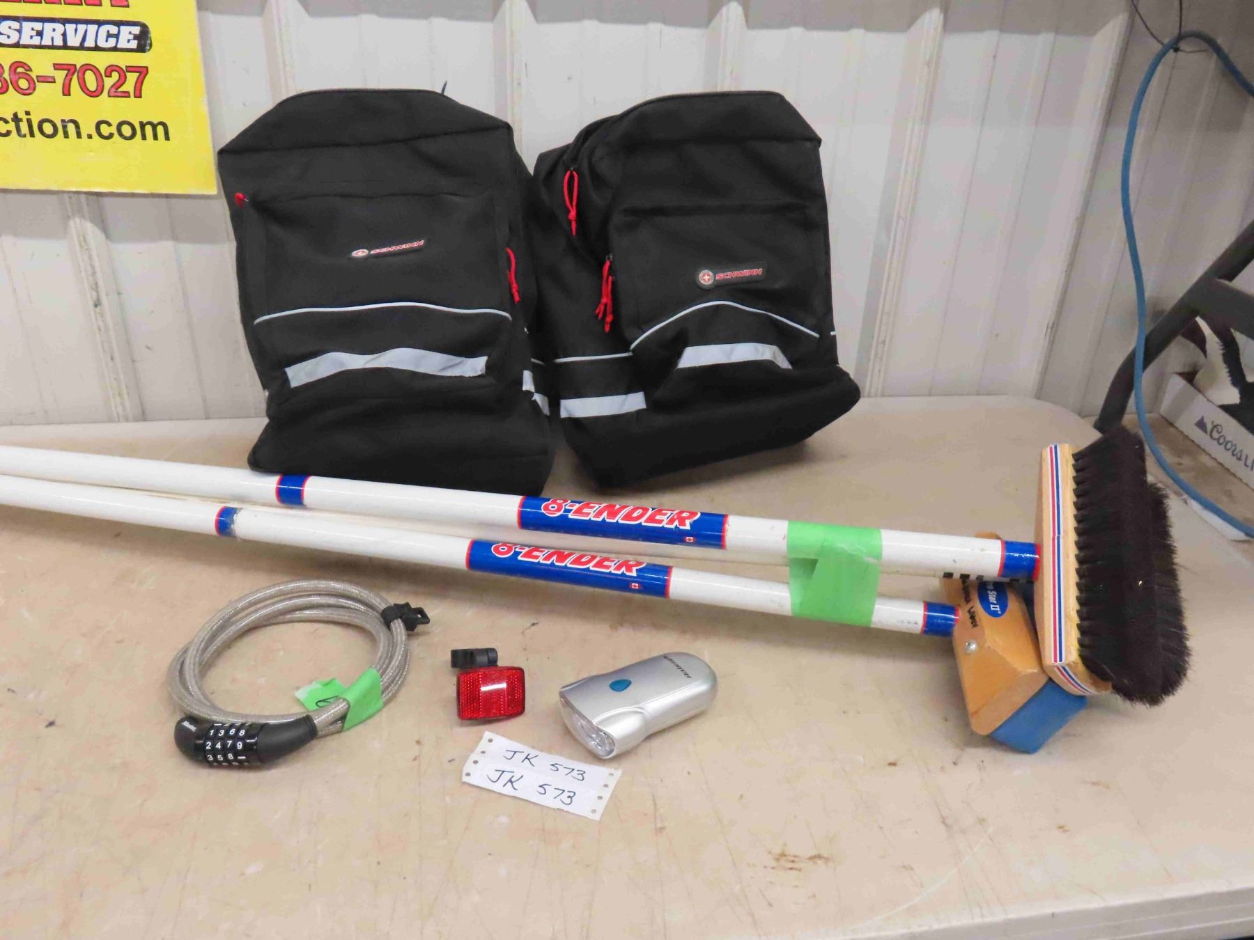 2 New Schwinn Bags , 3 Curling Brooms , Bicycle Lock & More