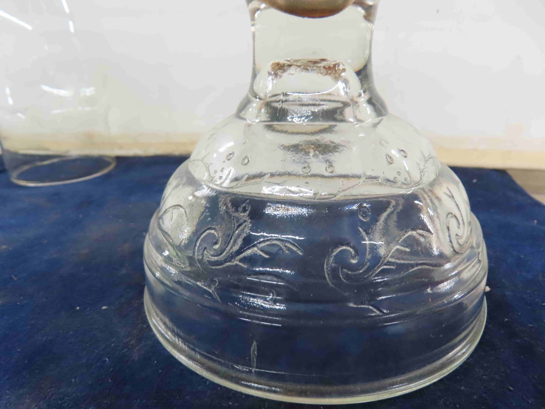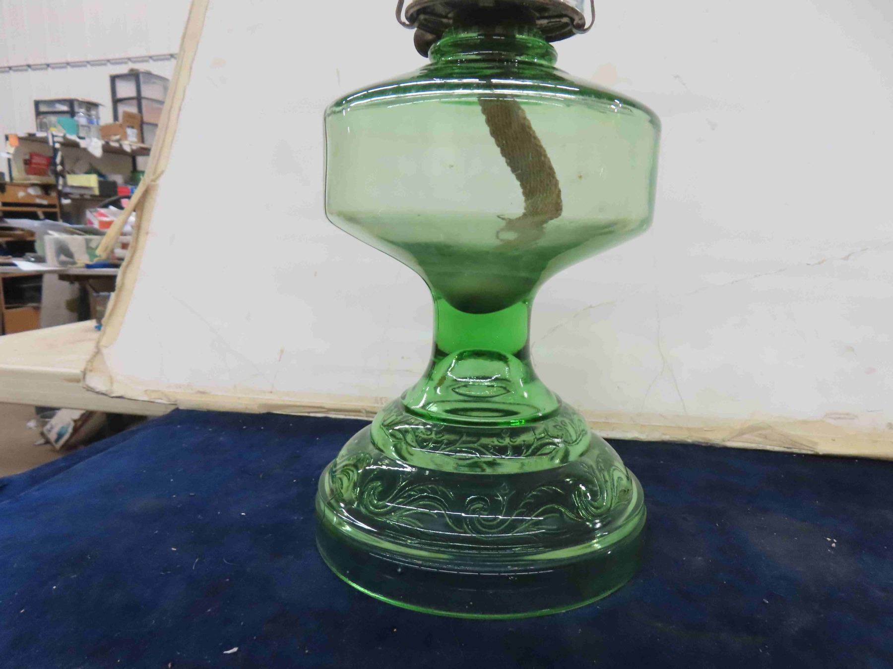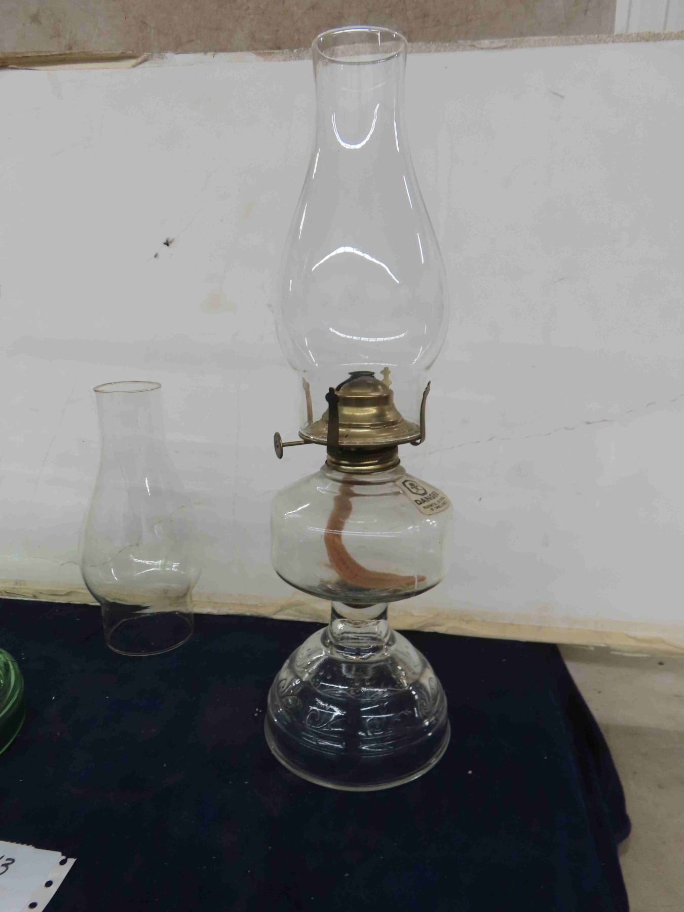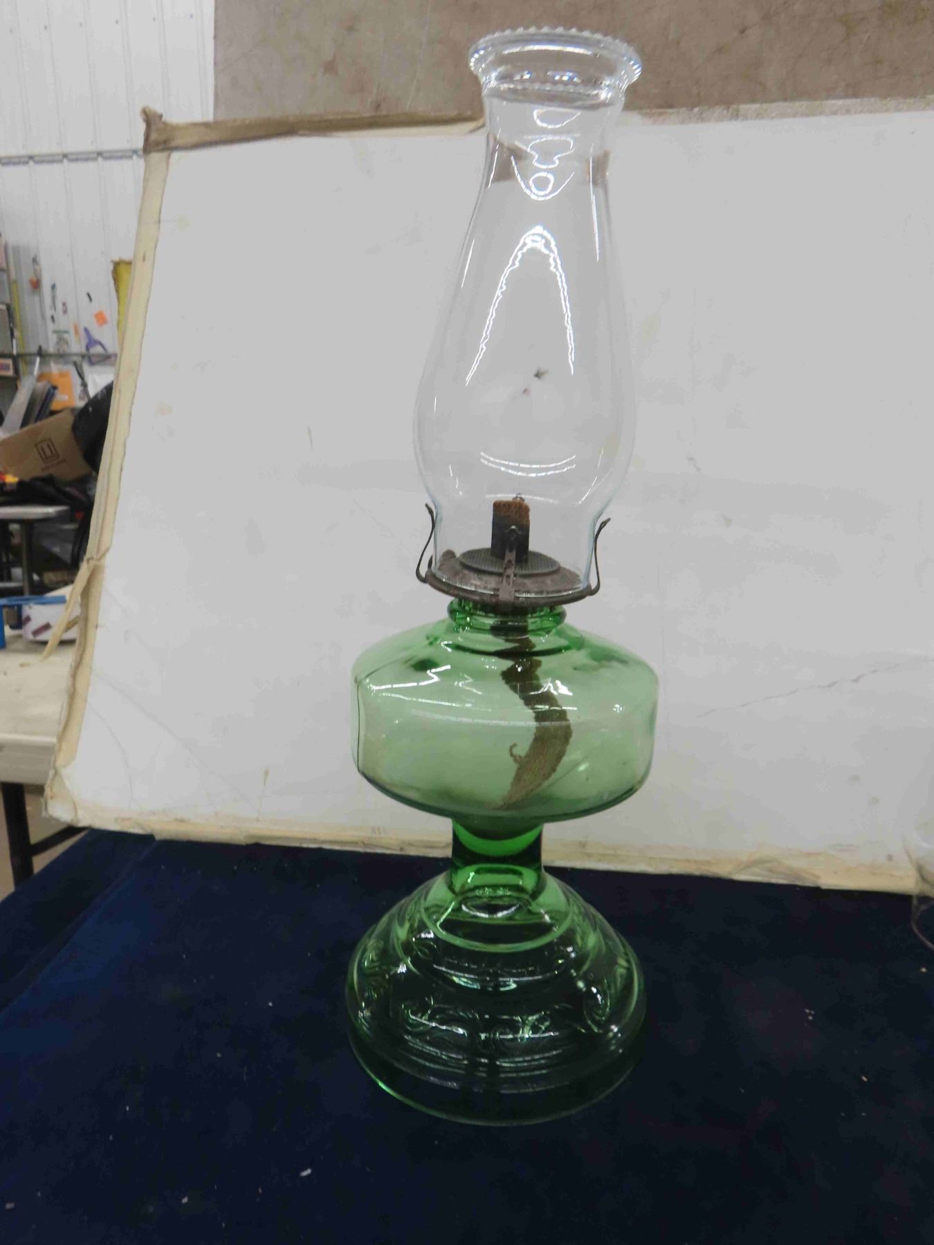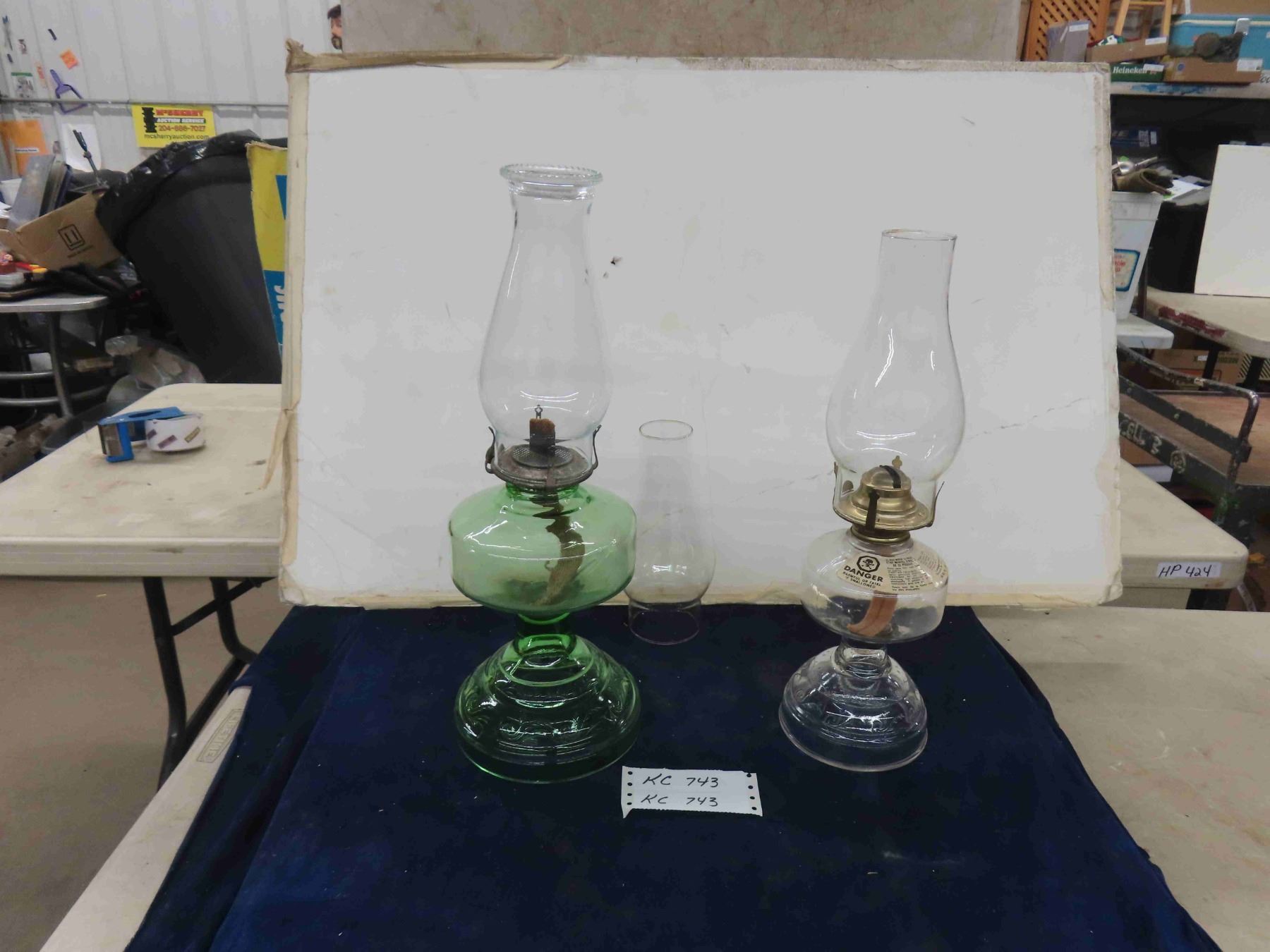 2 Oil Lamps ; Clear + Green Depression Glass + Extra Chimney
