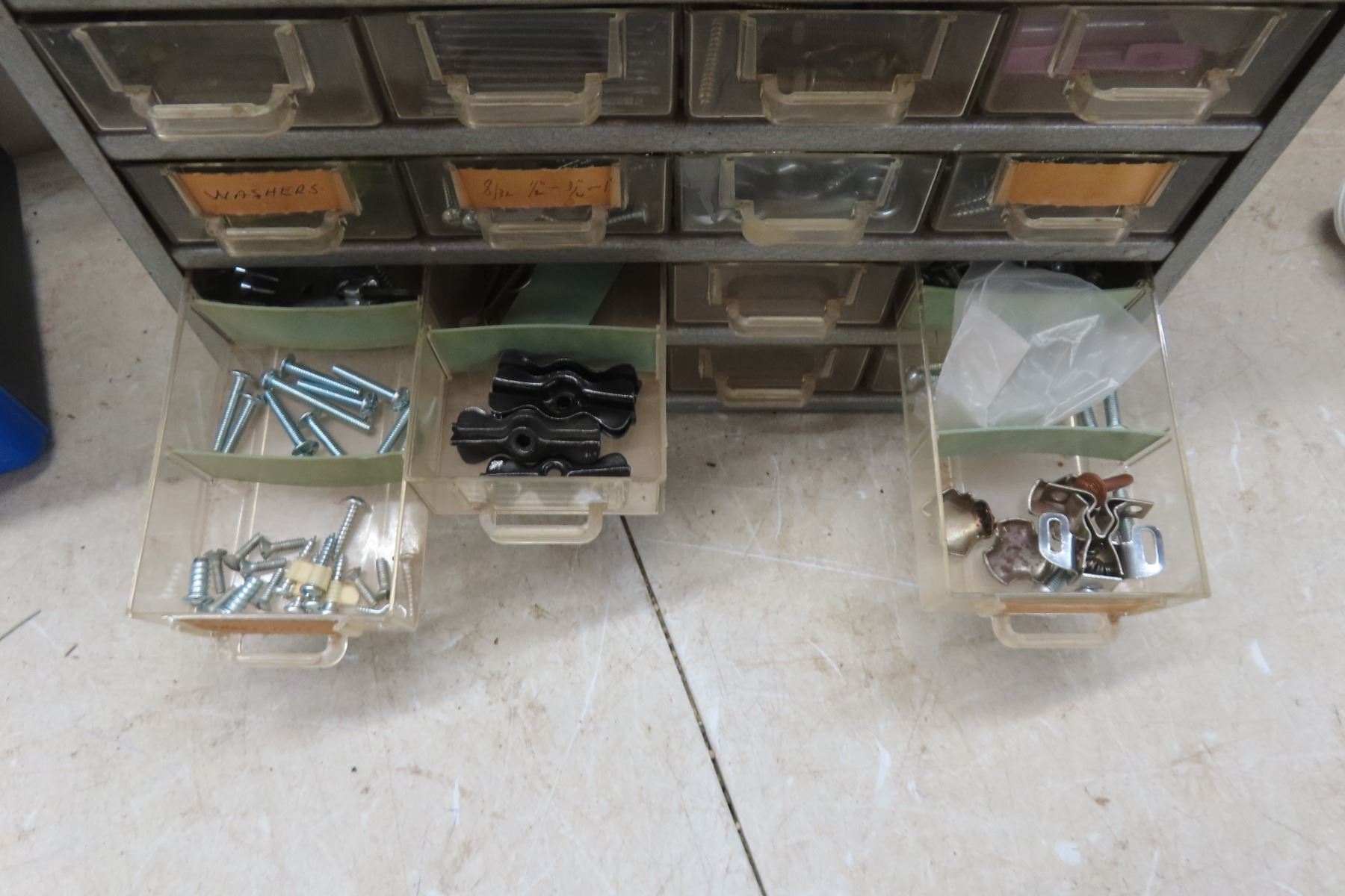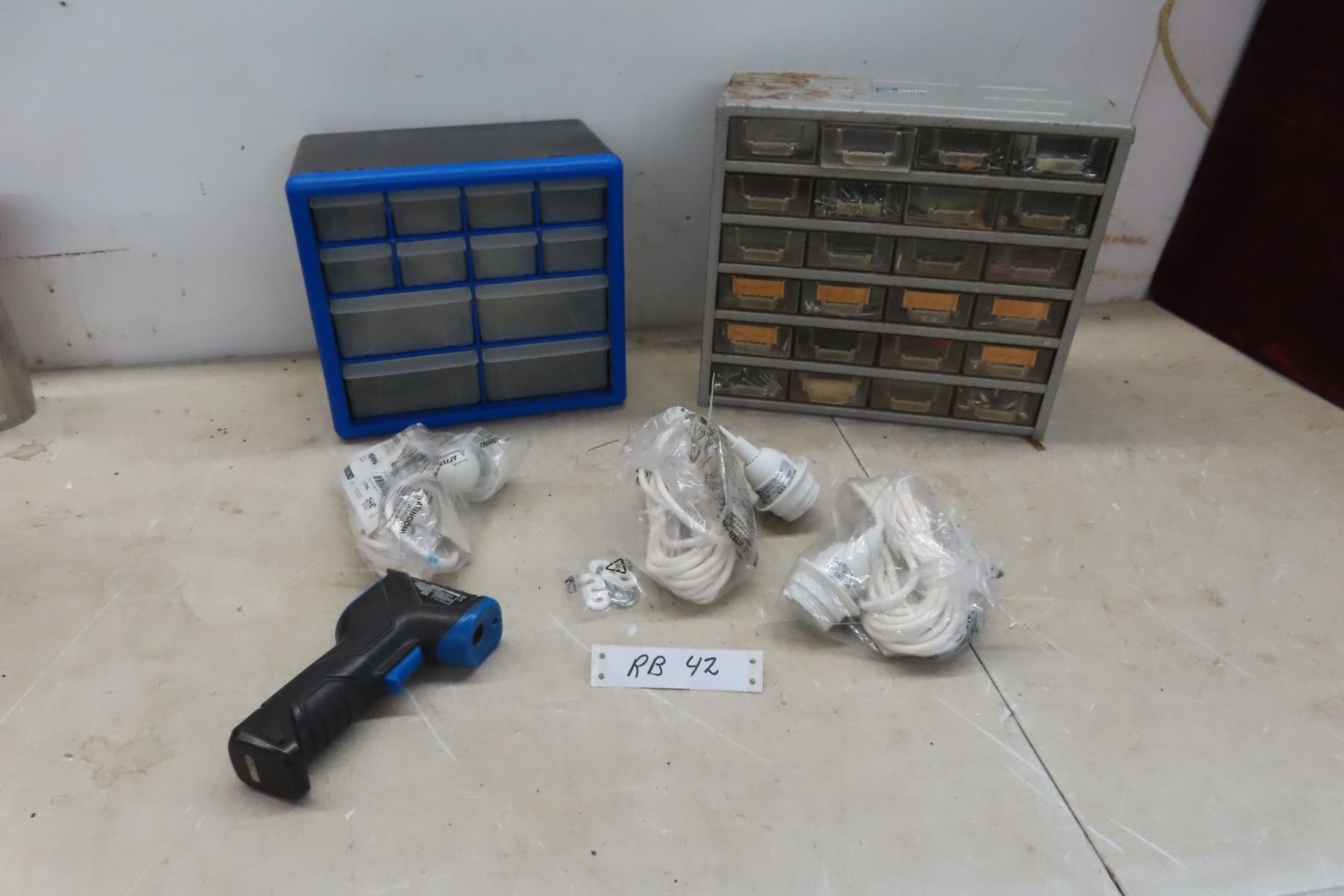 2 Organizers Filled with Fasteners, 3 New Hanging Lights and Digital Temperature Gun