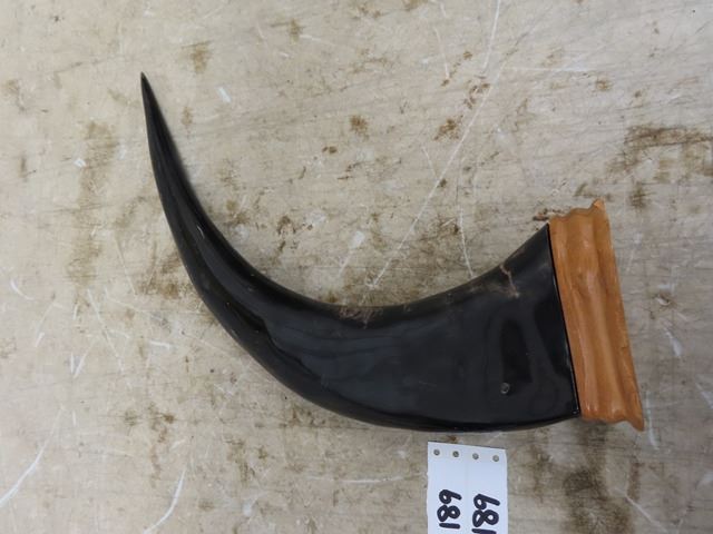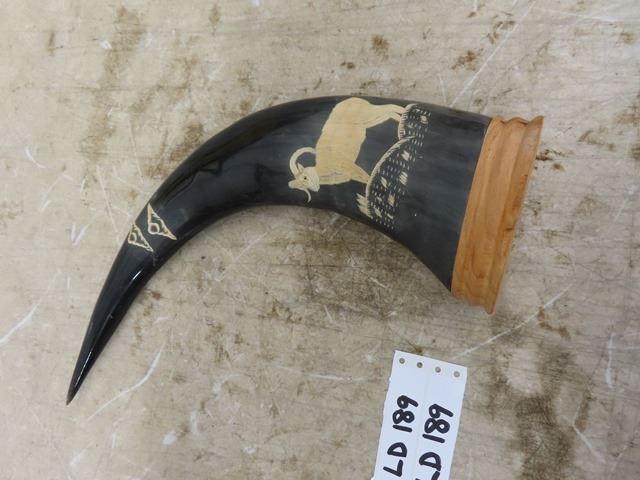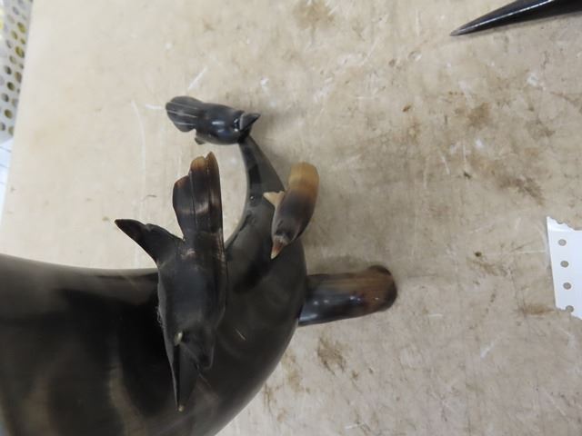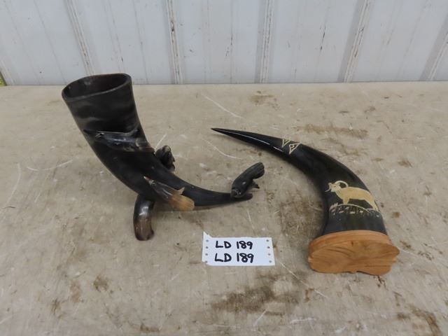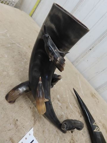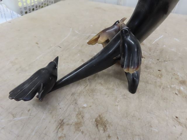 2 Ornamental Horns- Carved Mountain Goat + Birds