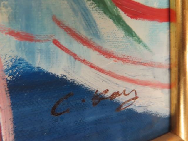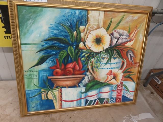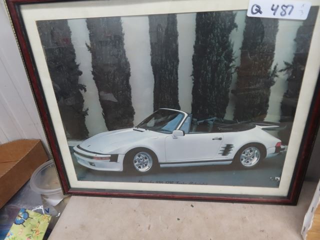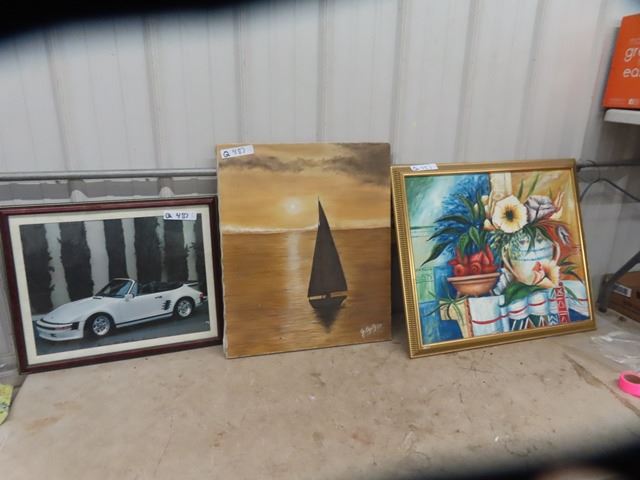 2 Paintings on Canvas, & Picture of Porche Car, One w Appraisal Copy on Back
