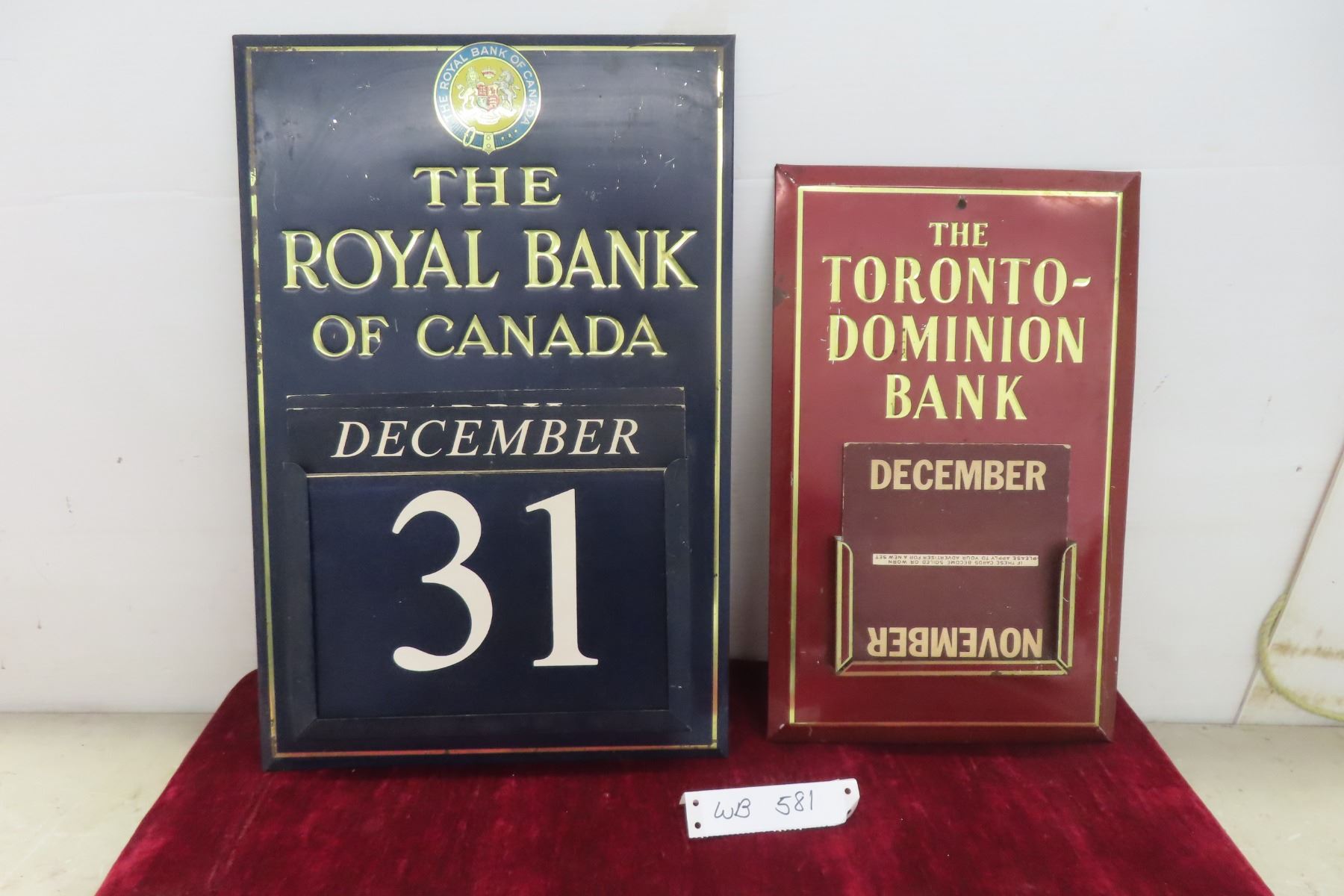 2 Perpetual Tin Calendars: Royal bank of Canada Complete with 12 Months + 31 Days 18.5"x12", Toronto Dominion Bank with 12 Months ( No Cards for the Days ) 15 1/4"x9 1/2"
