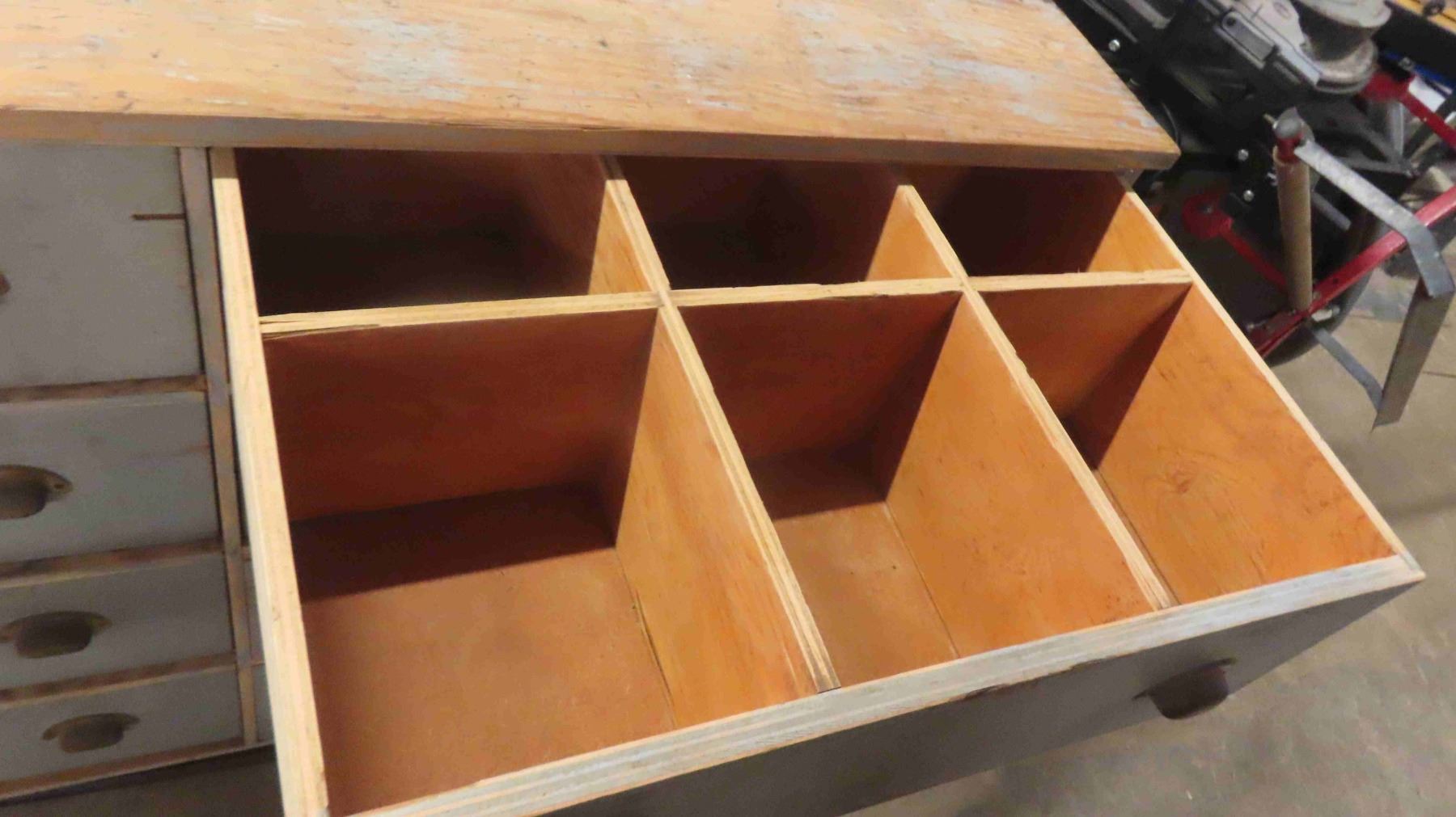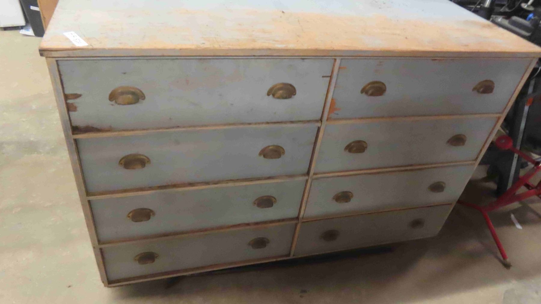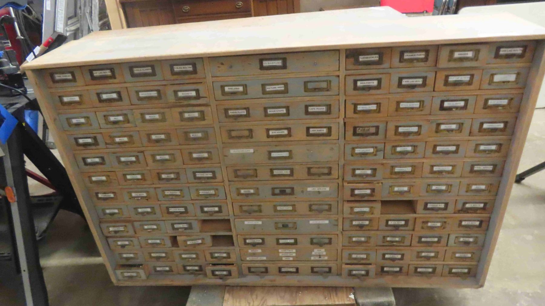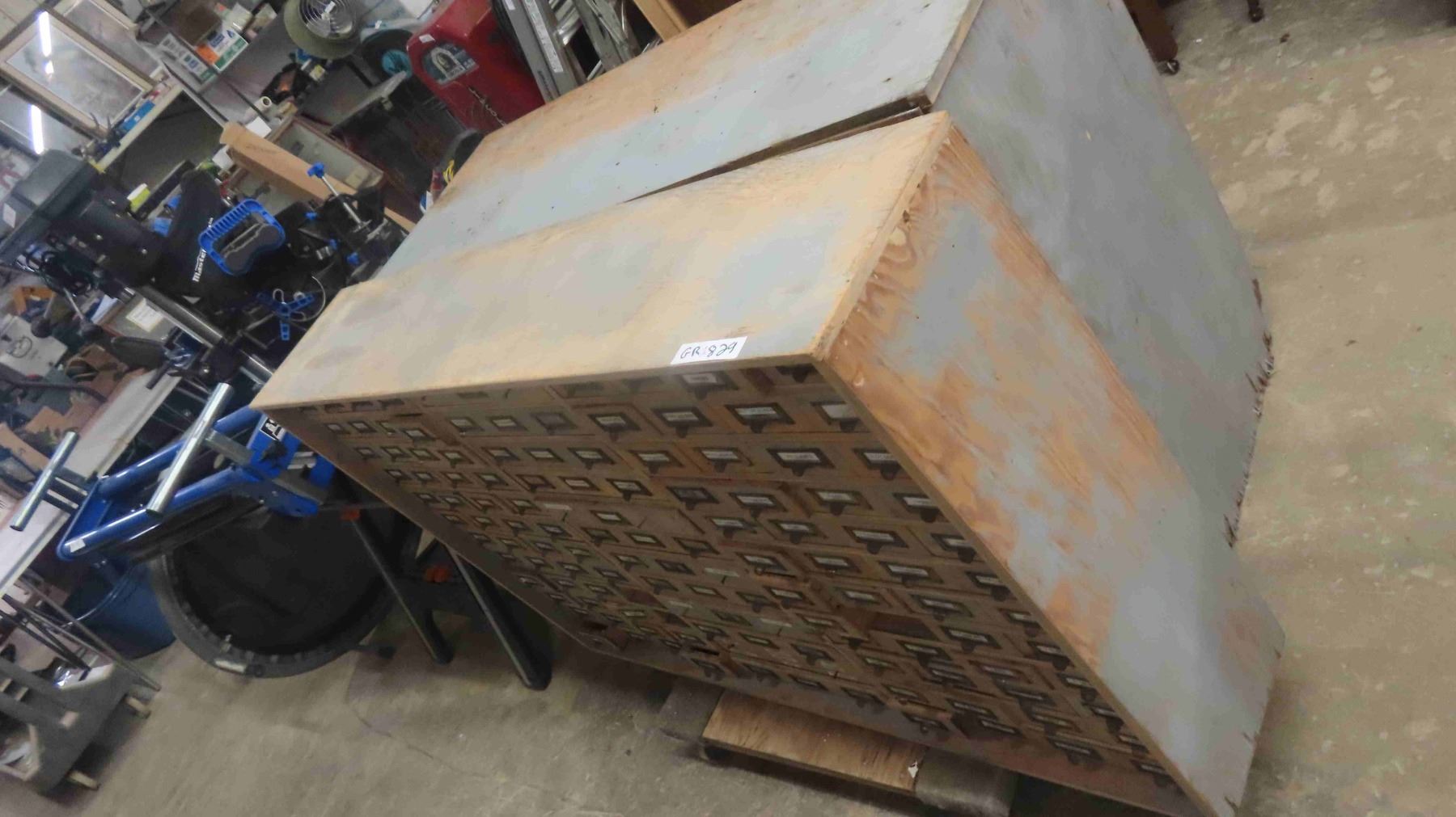 2 Piece Wood Cabinet : Bottom Portion Has 8 Drawers and Measures 38'' x 57'' x 22'' , Top Portion Has 108 Index Style Drawers (3 Drawers Missing) Measures 35 1/2'' x 55'' x 11'' - Some Hardware in Drawers