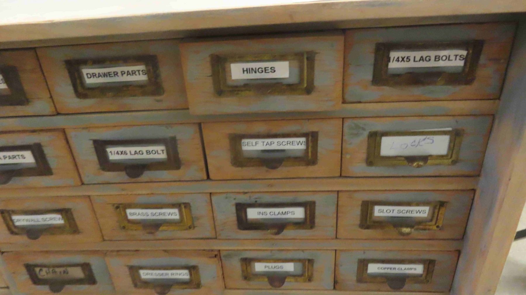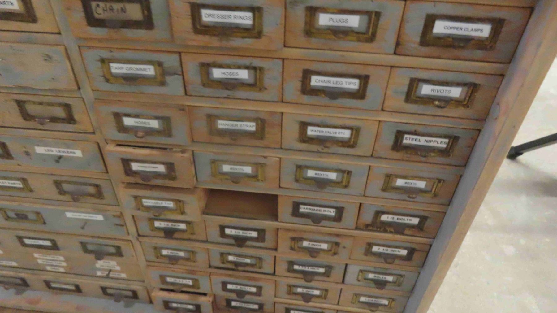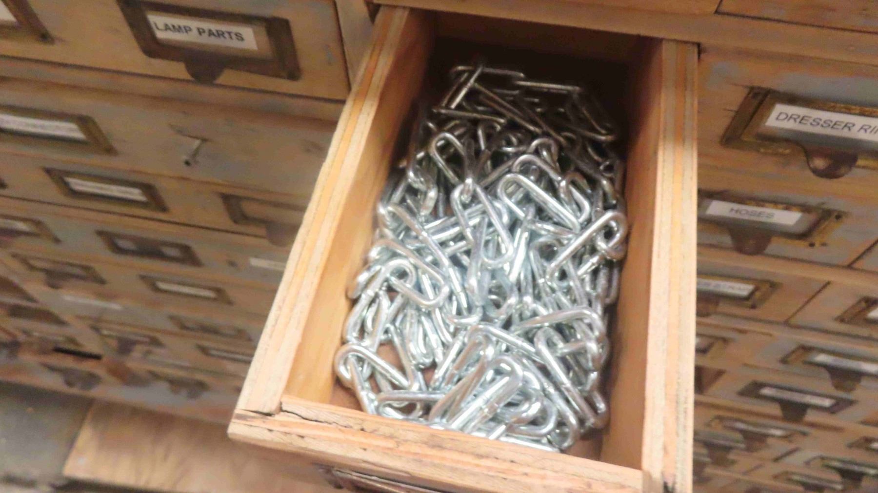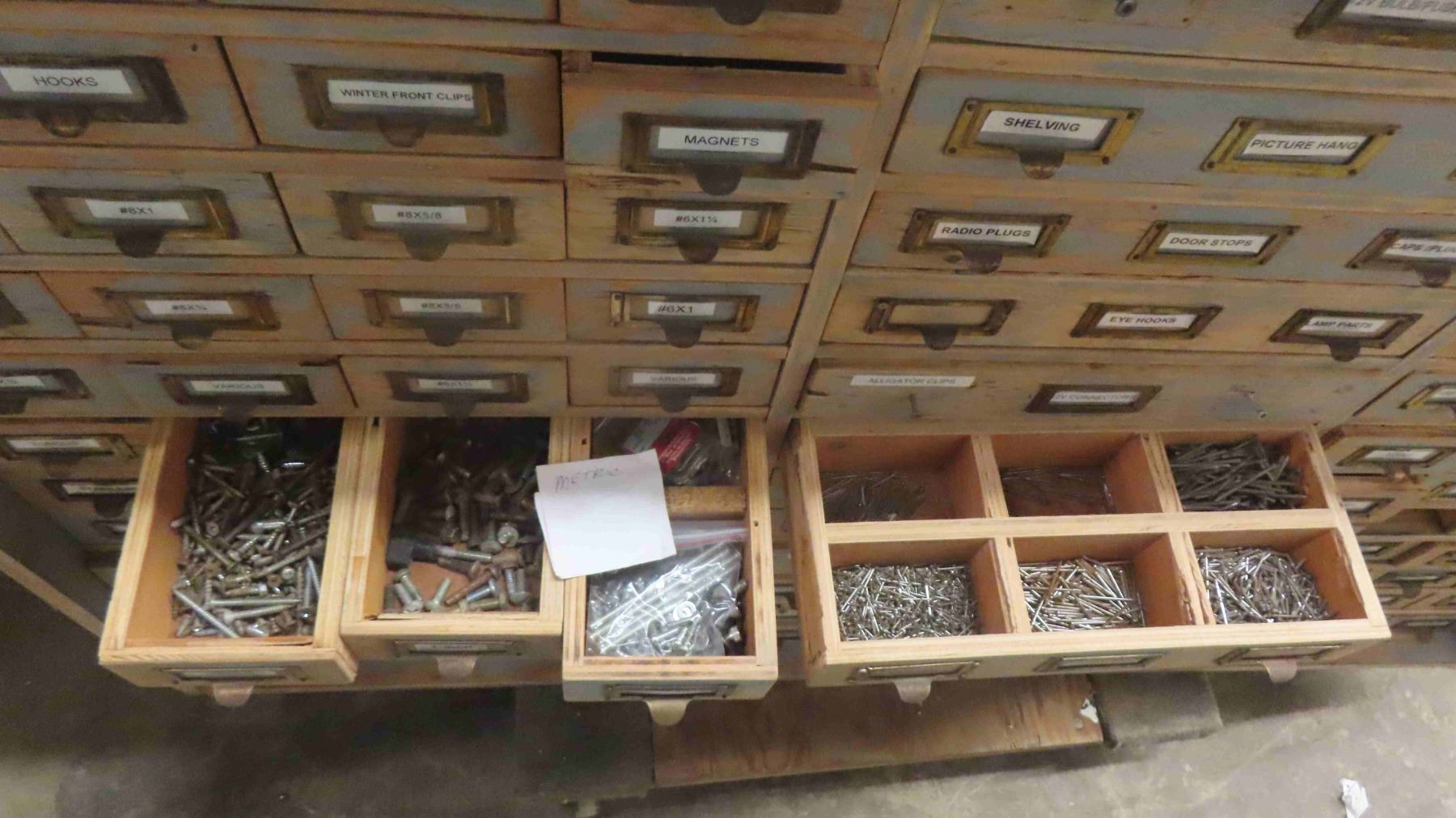 2 Piece Wood Cabinet : Bottom Portion Has 8 Drawers and Measures 38'' x 57'' x 22'' , Top Portion Has 108 Index Style Drawers (3 Drawers Missing) Measures 35 1/2'' x 55'' x 11'' - Some Hardware in Drawers
