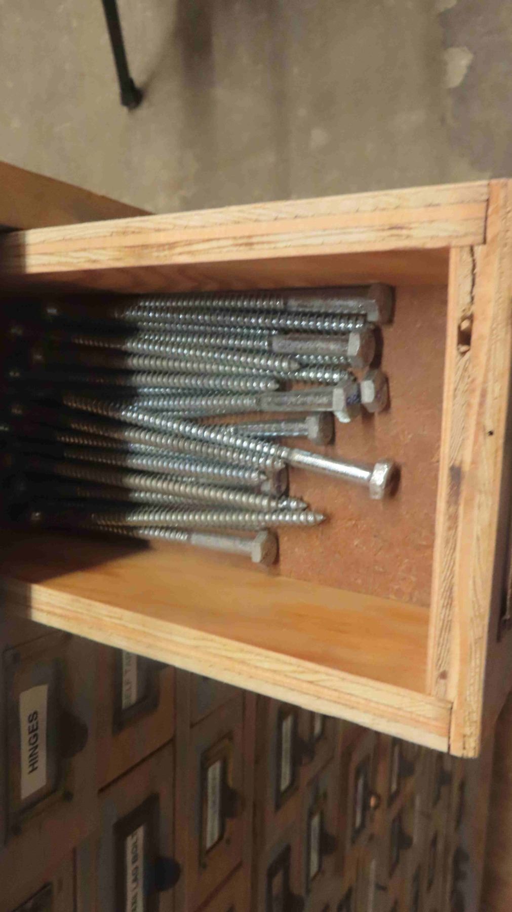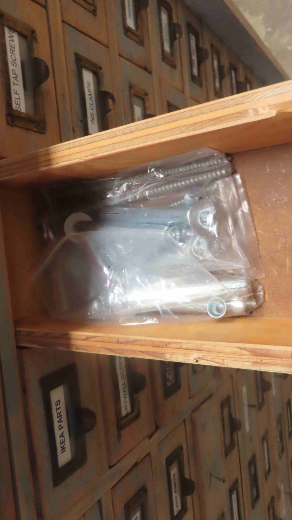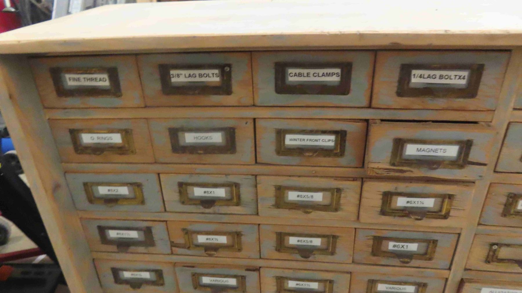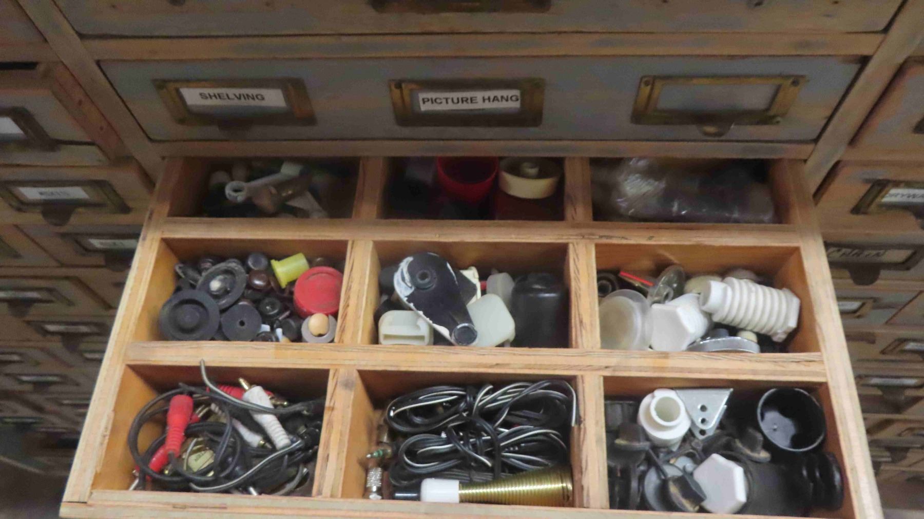 2 Piece Wood Cabinet : Bottom Portion Has 8 Drawers and Measures 38'' x 57'' x 22'' , Top Portion Has 108 Index Style Drawers (3 Drawers Missing) Measures 35 1/2'' x 55'' x 11'' - Some Hardware in Drawers