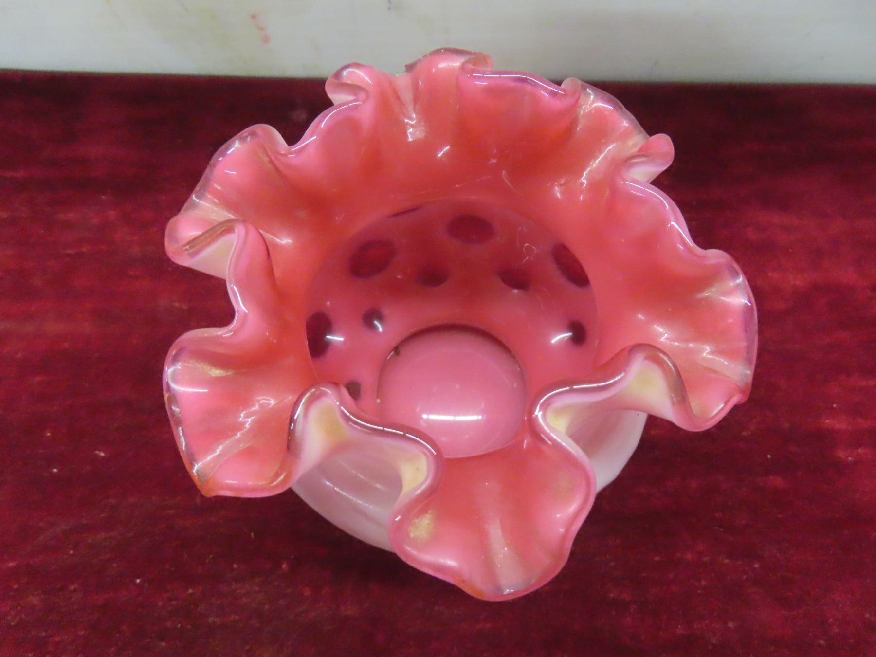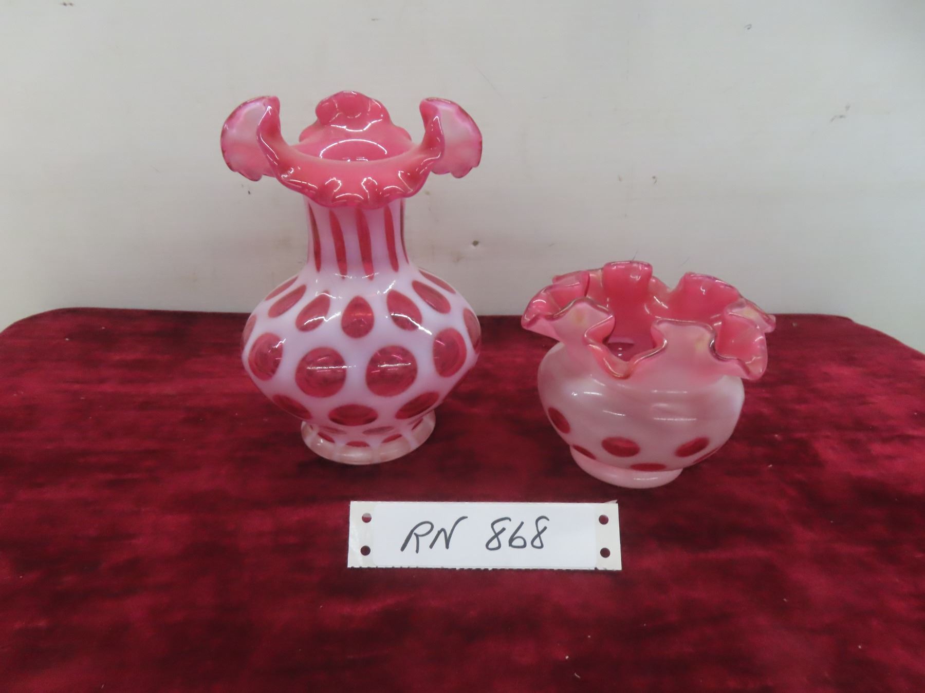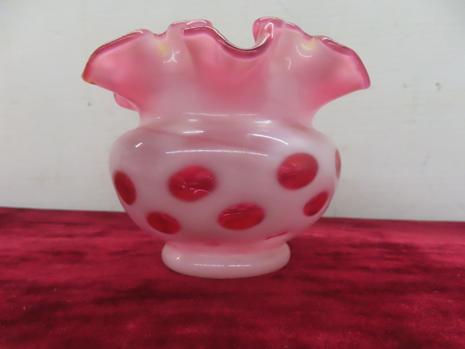 2 Pieces Vintage Fenton Cranberry Opalescent Coin Dot Vase & Bowl W/ Ruffled Edges