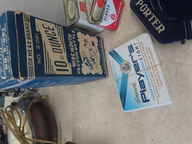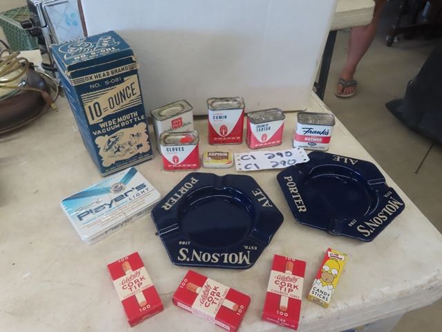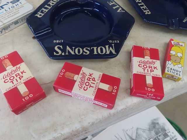 2 Porcelain Molson Ashtrays ( Excellent Condition) New Old Stock Cork Tip Rolling Papers, Spice Tins, Players Cigarette Tin, 10 oz Thermos with Box