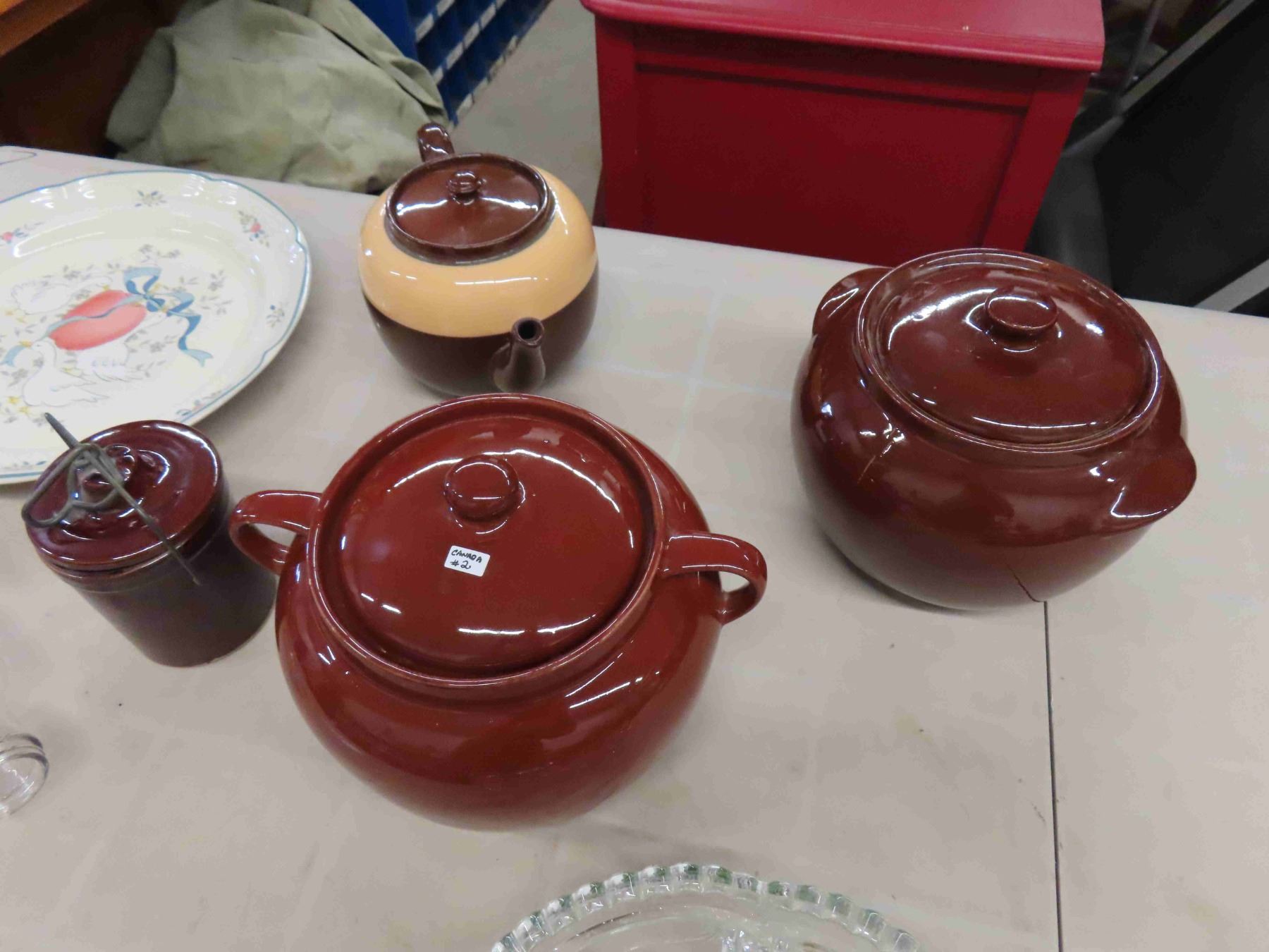 2 Pottery Bean Pots, Pottery Tea Pot, Mustard Jar, Glass Rolling Pin, Glass Bowl,