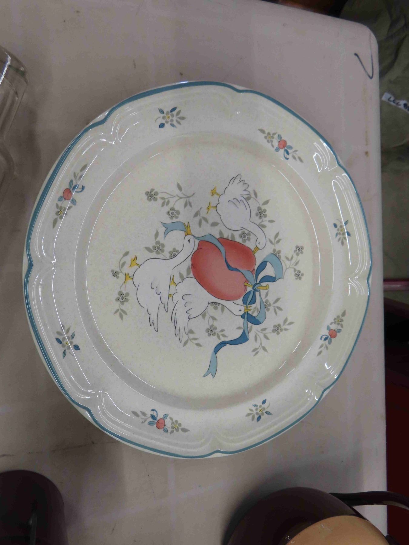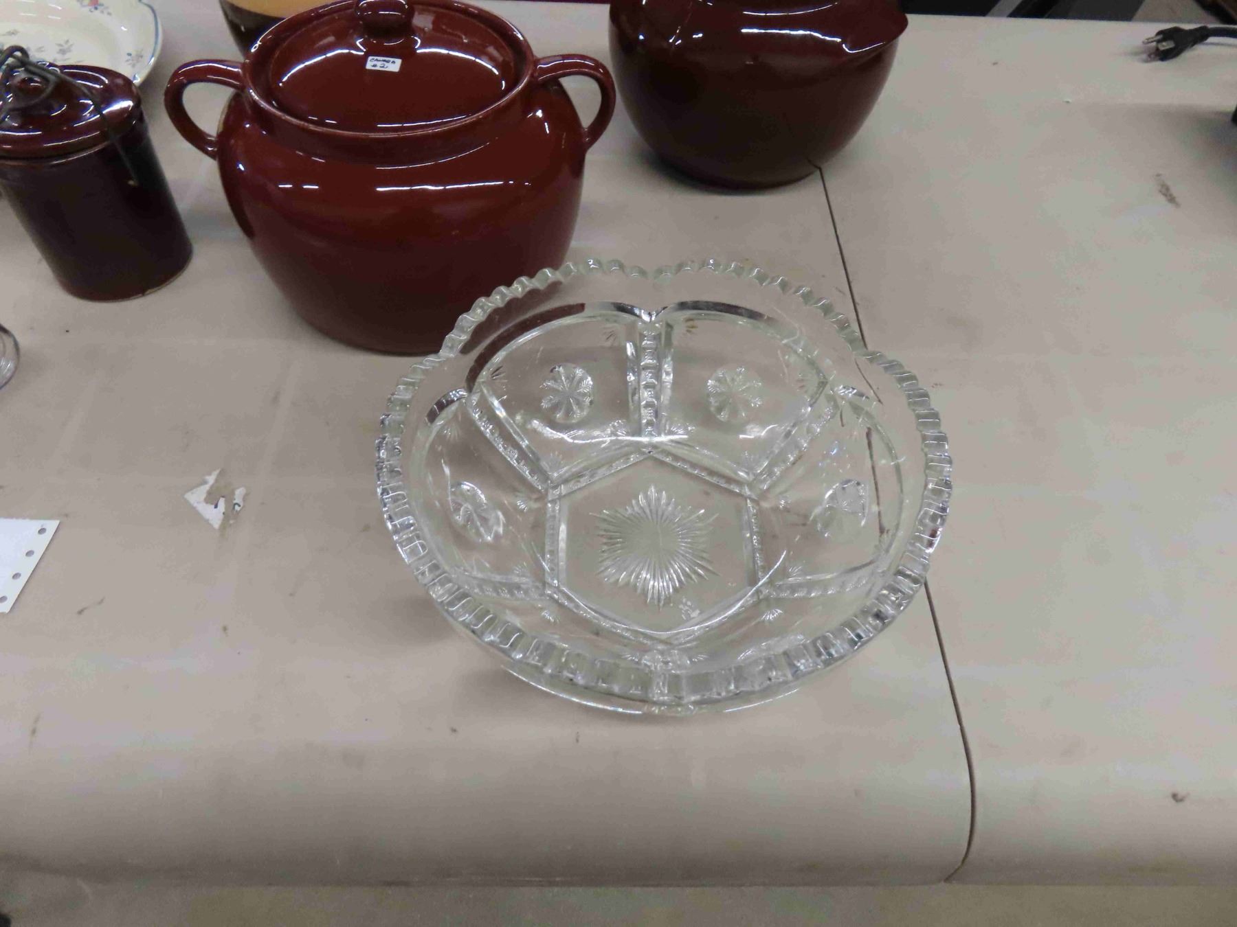 2 Pottery Bean Pots, Pottery Tea Pot, Mustard Jar, Glass Rolling Pin, Glass Bowl, Goose Plate