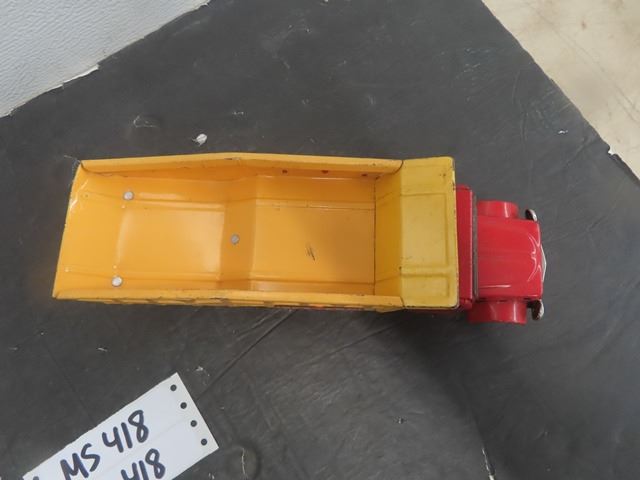 2 Pressed Tin Dump Trucks: 1 Battery Operated with Plastic Cab 9" Long + Western is Friction Powered 11" Long