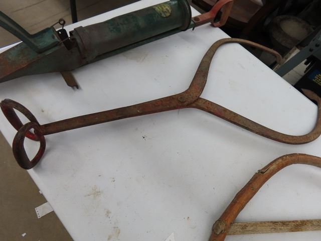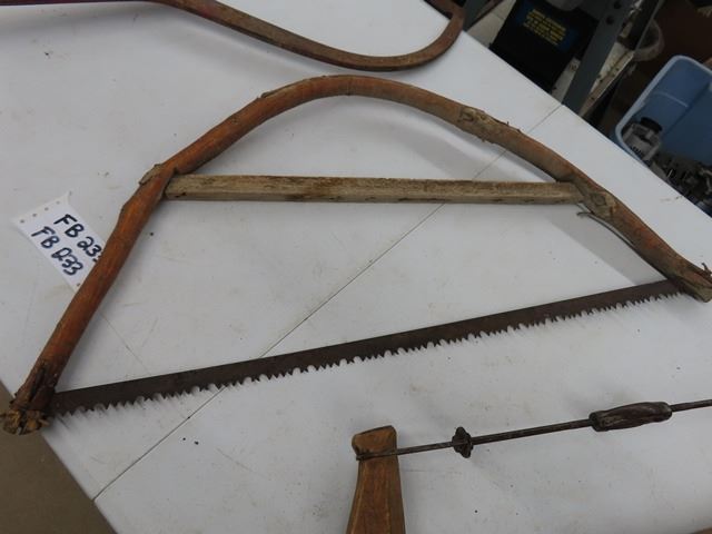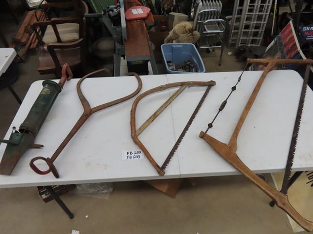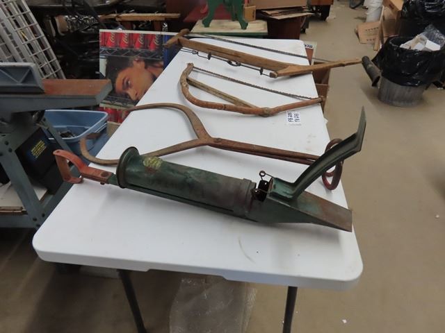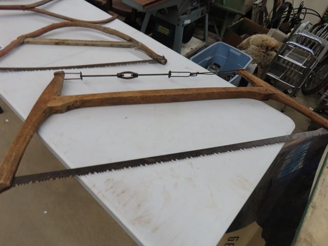 2 Primitive Wooden Buck Saws, Ice/ Log Tongs, Potato Planter