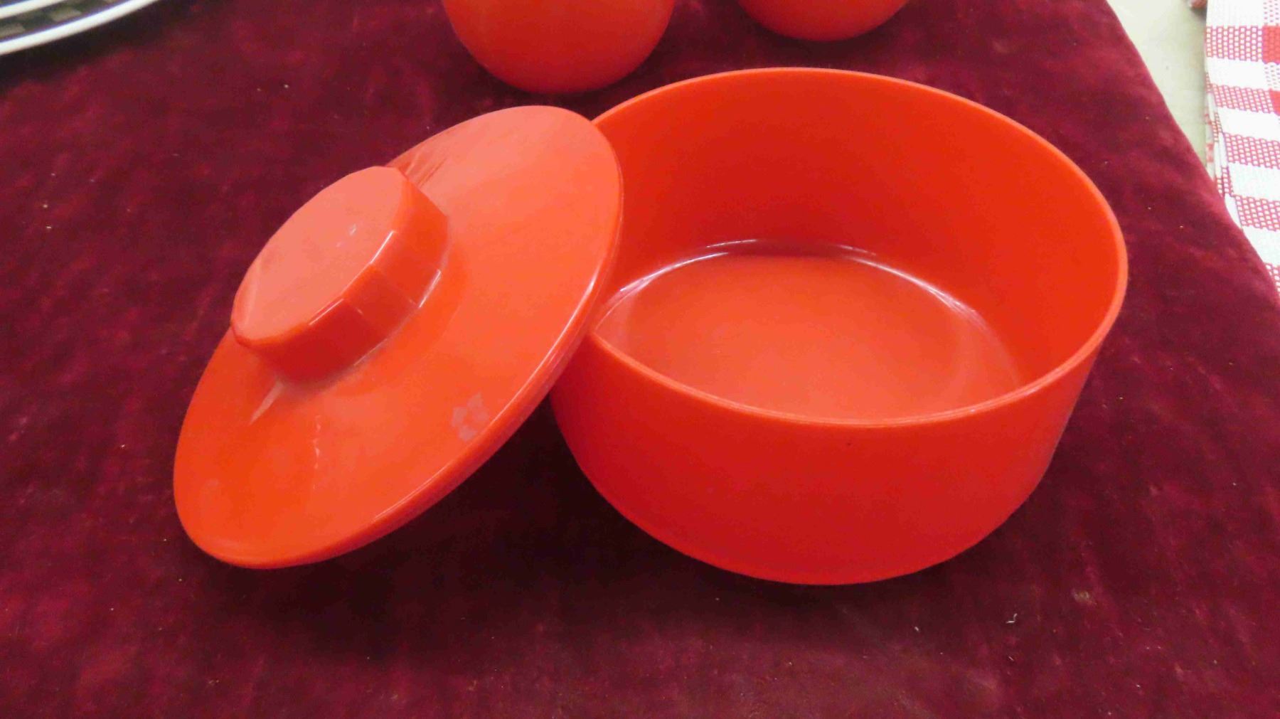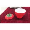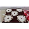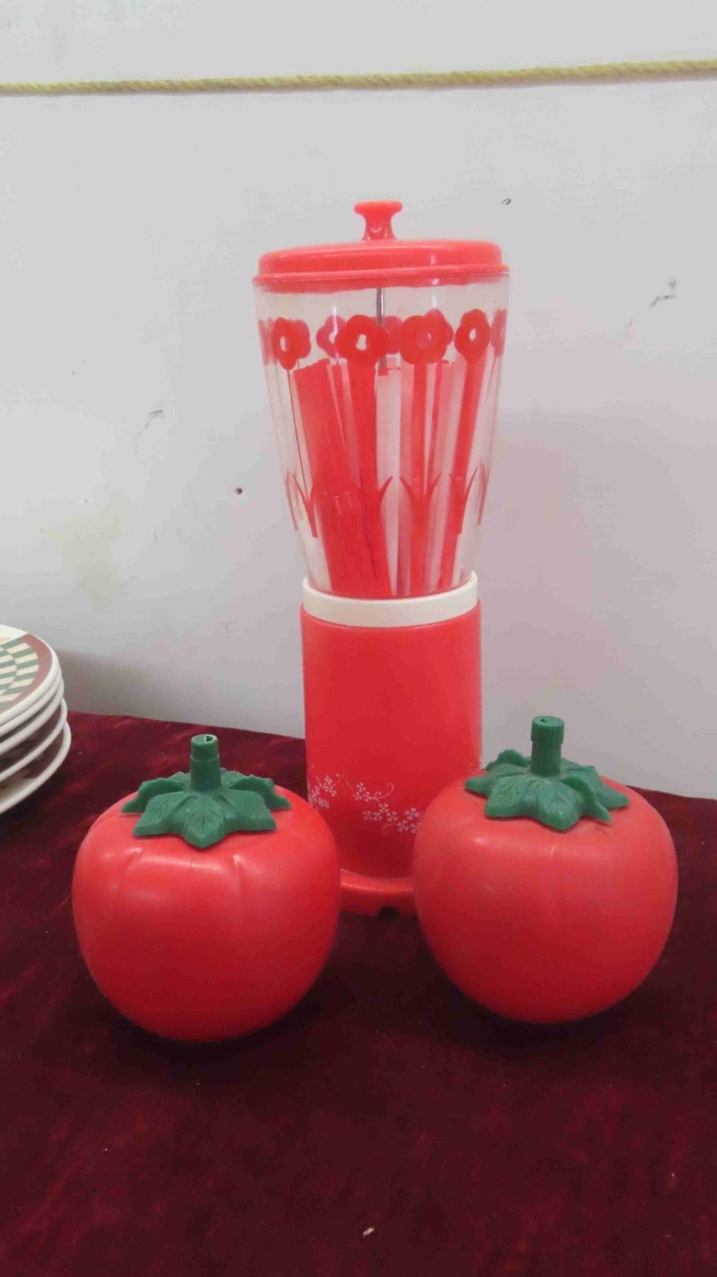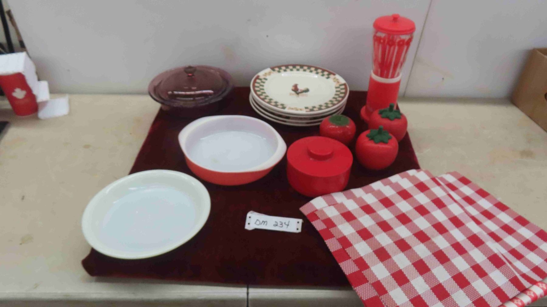 2 Pyrex Dishes , 5 Rooster Plates , Casserole Dish , 2 Plastic Squeeze Tomatoes, Place Mats