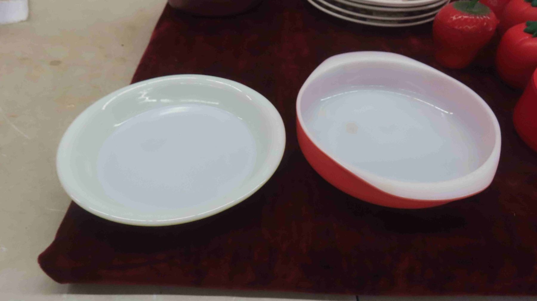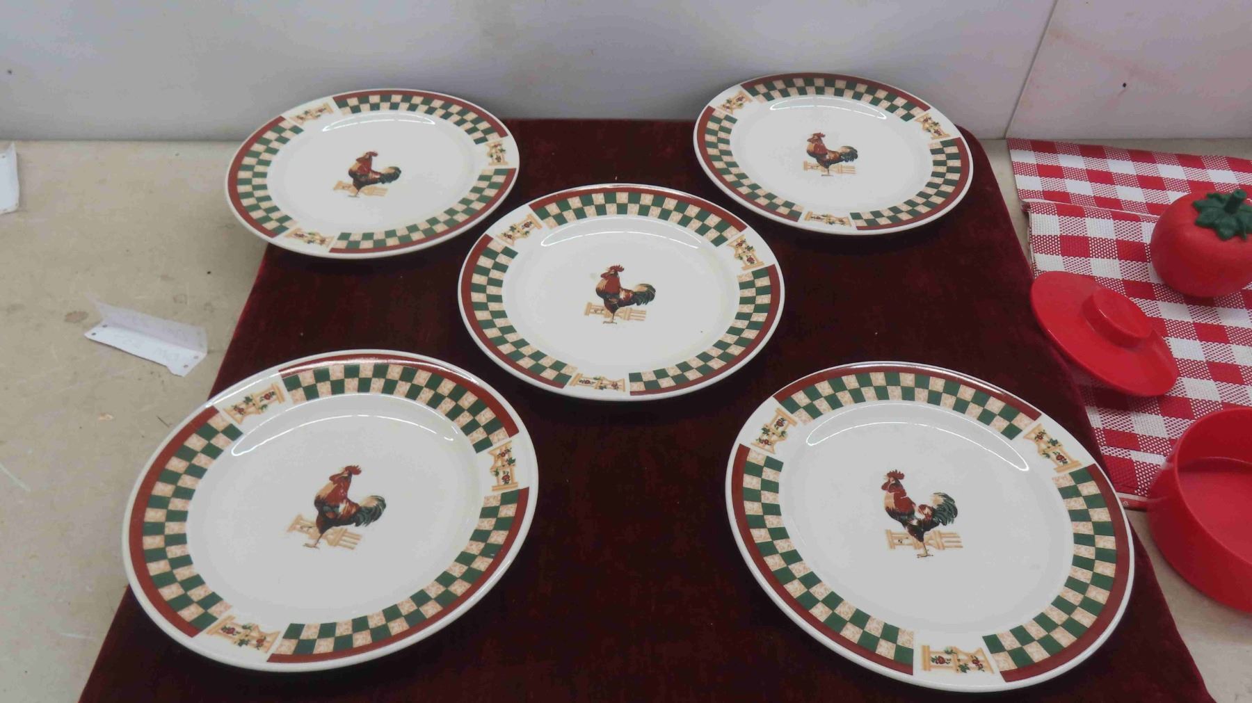 2 Pyrex Dishes , 5 Rooster Plates , Casserole Dish , 2 Plastic