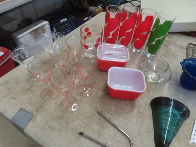 2 Pyrex Pieces, Glasses, Blue Mountain, Humming Bird Feeder plus more