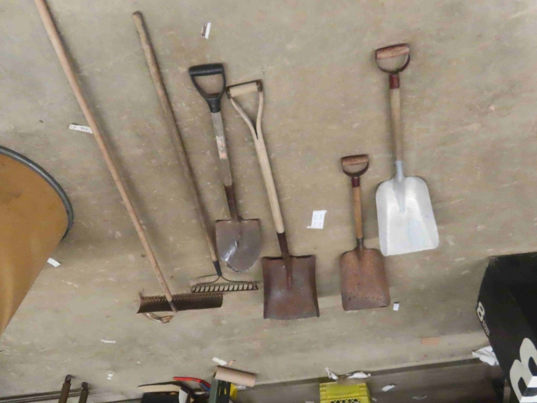 2 Rakes, Spade, 2 Steel Shovels, 1 Aluminum Shovel