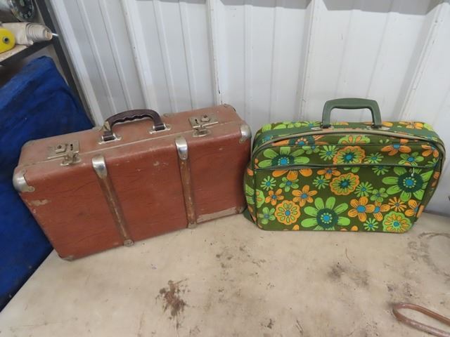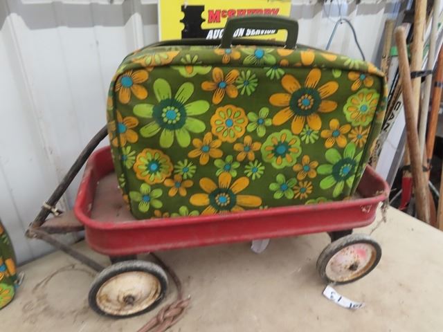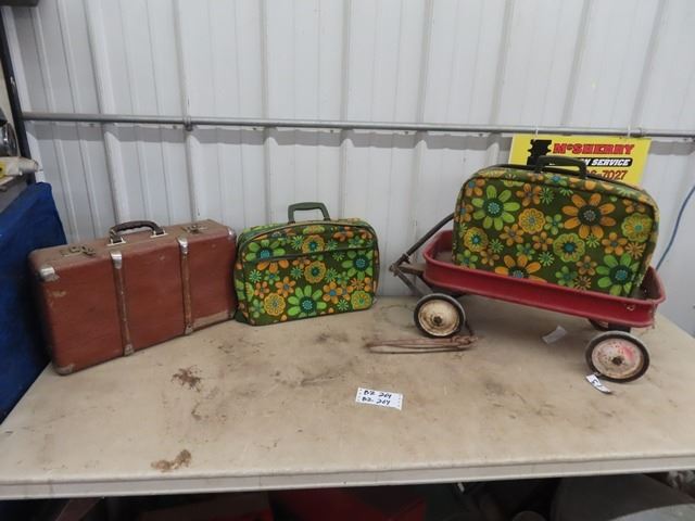 2 Retro Hippy Suitcases, Leather Suitcase, & Child Red Wagon