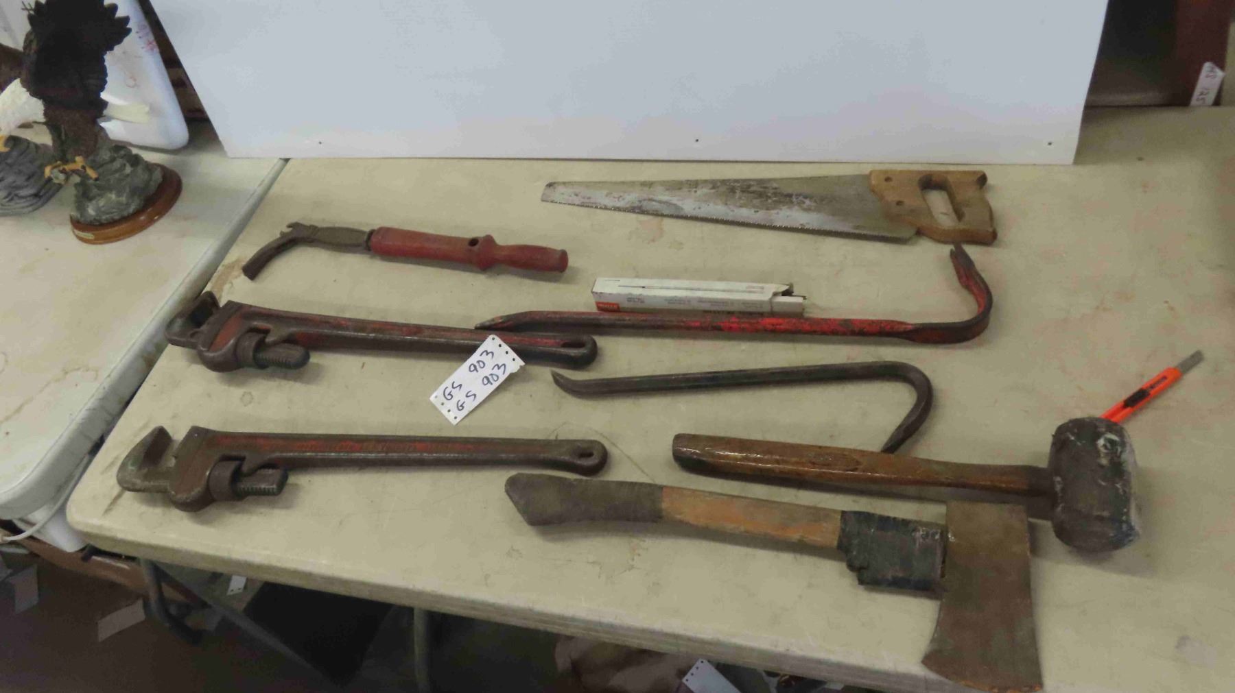 2 Ridgid Pipe Wrenches, Nail Puller, Saw, Wrecking Bar, Caulking Gun