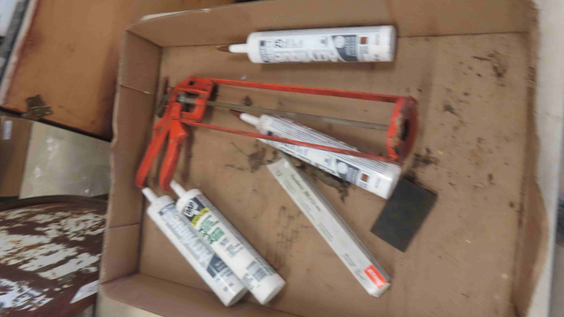 2 Ridgid Pipe Wrenches, Nail Puller, Saw, Wrecking Bar, Caulking Gun & Caulking
