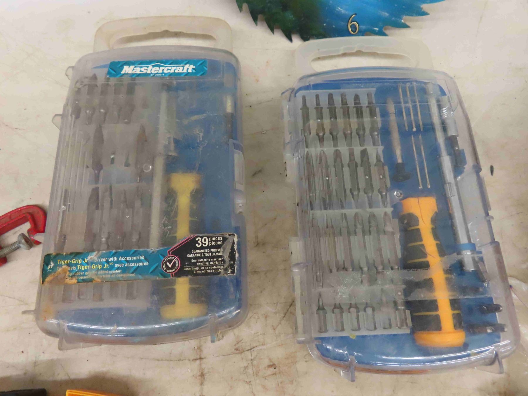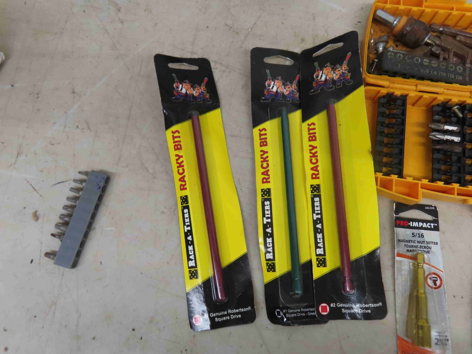 2 Screwdrivers + Bit Kits, Parts Tote with Stuff, Allen Keys, Assorted Bits, Gold Bag with Surprise ( not nuts) , Saw Blade Clock