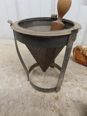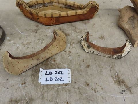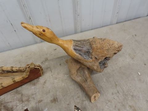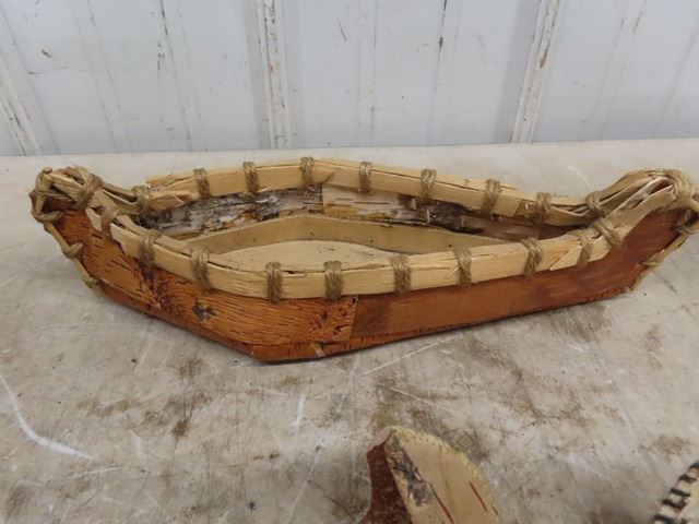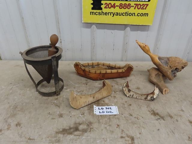 2 Small Birch Bark Canoes, 1 Larger Canoe, Carved Duck, Fruit Press Sieve