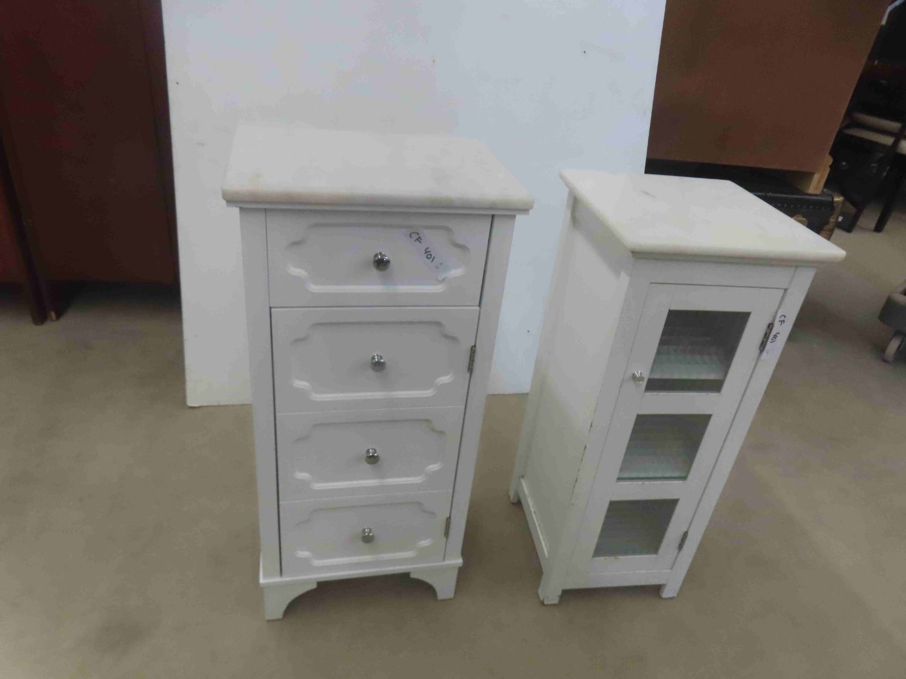 2 Stands/Cabinets, Both with Marble Top (1) 4 Drawer 32'' x 15'' x 12'' (1) with Door & Shelves 30'' x 13'' x 13''