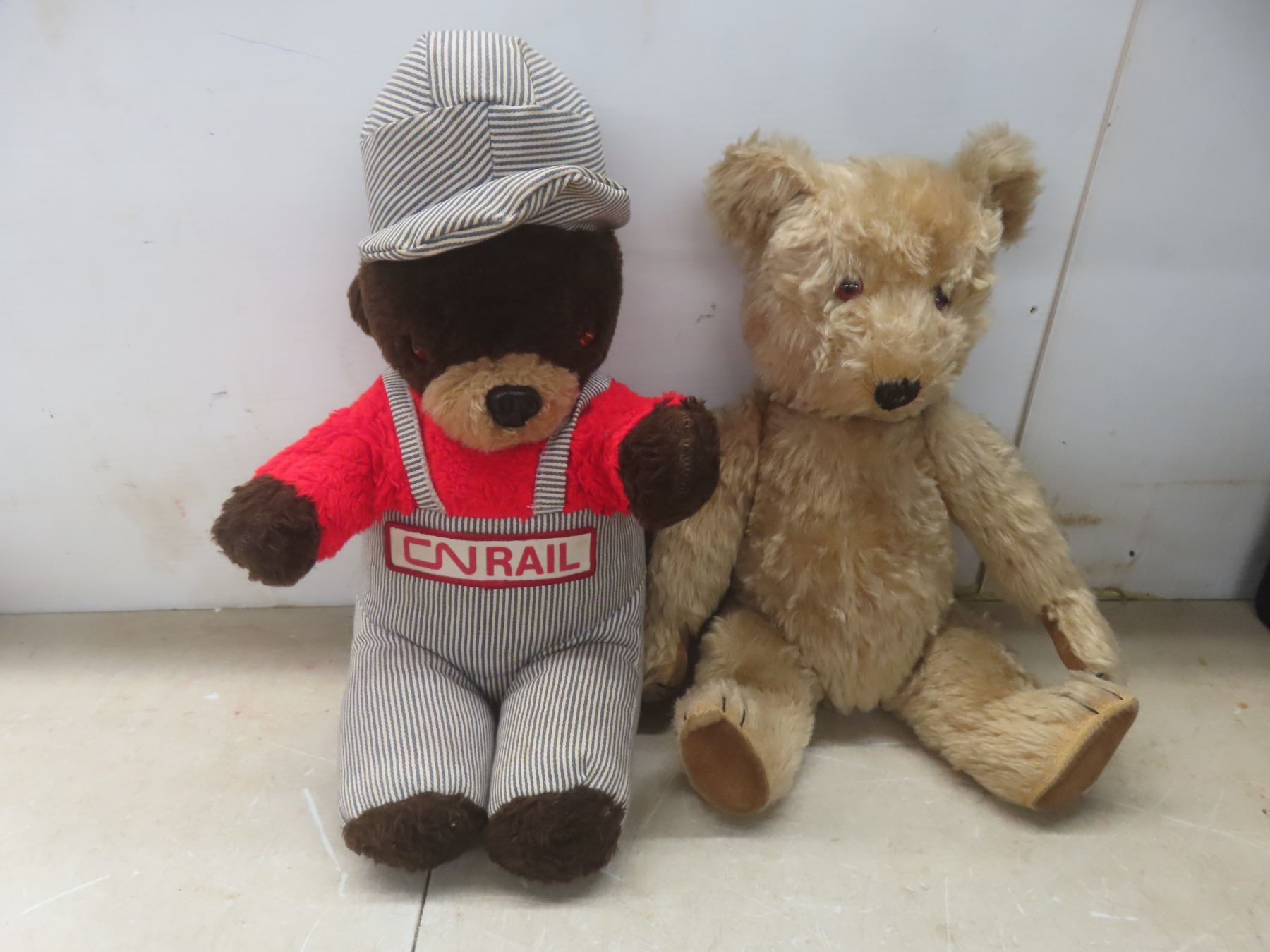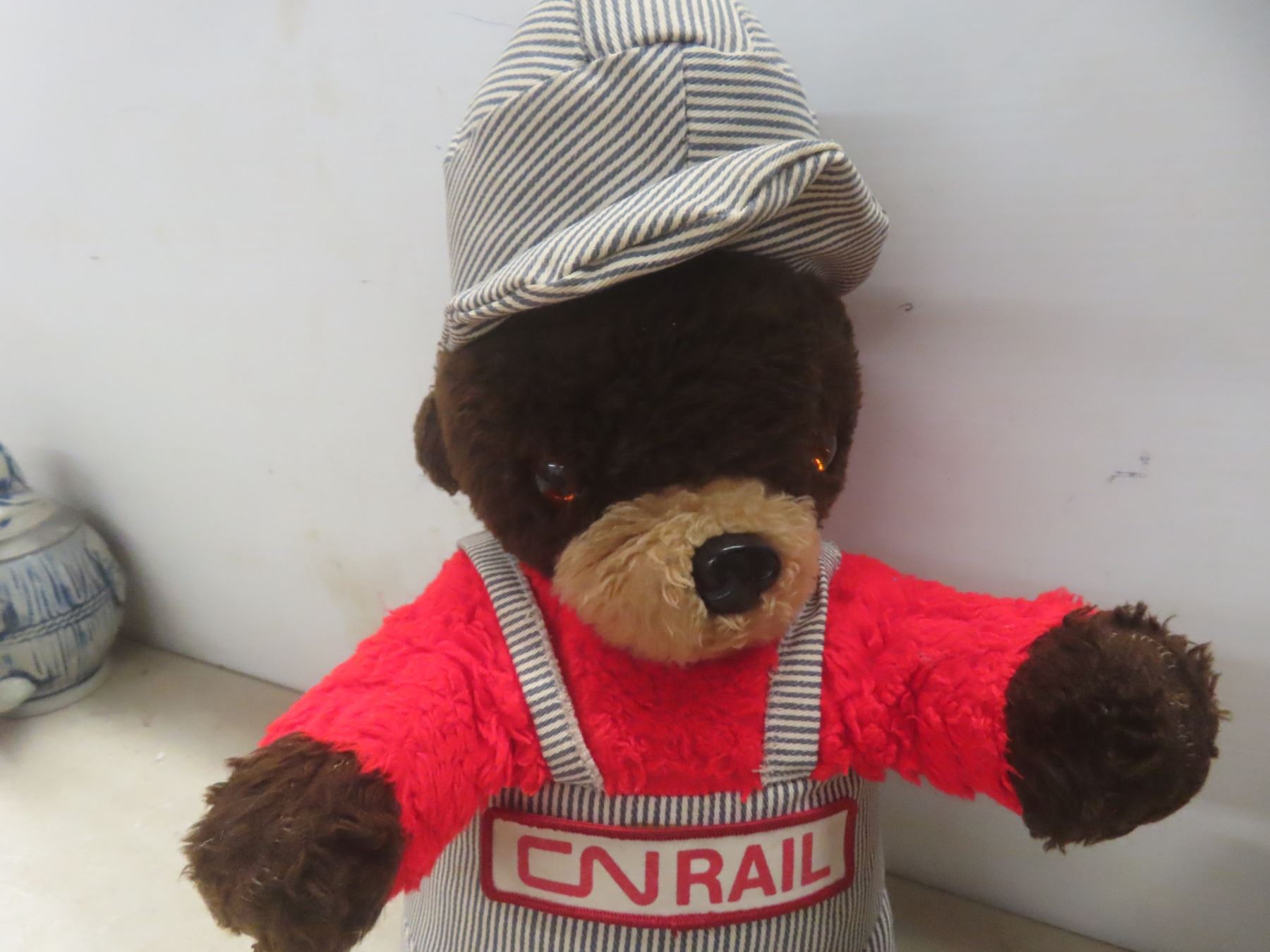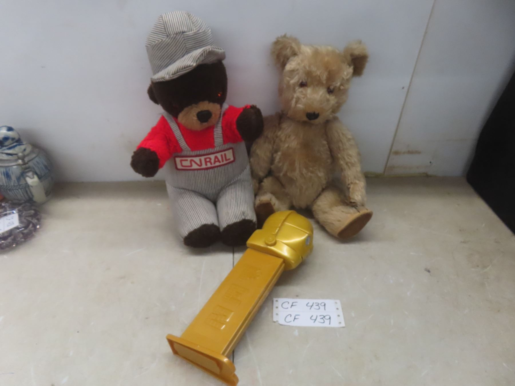 2 Stuffy Bears one with CN Rail Outfit and Supersize Pez