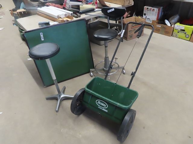 2 Swivel Stools & Grass Seed Broadcaster & Card Table