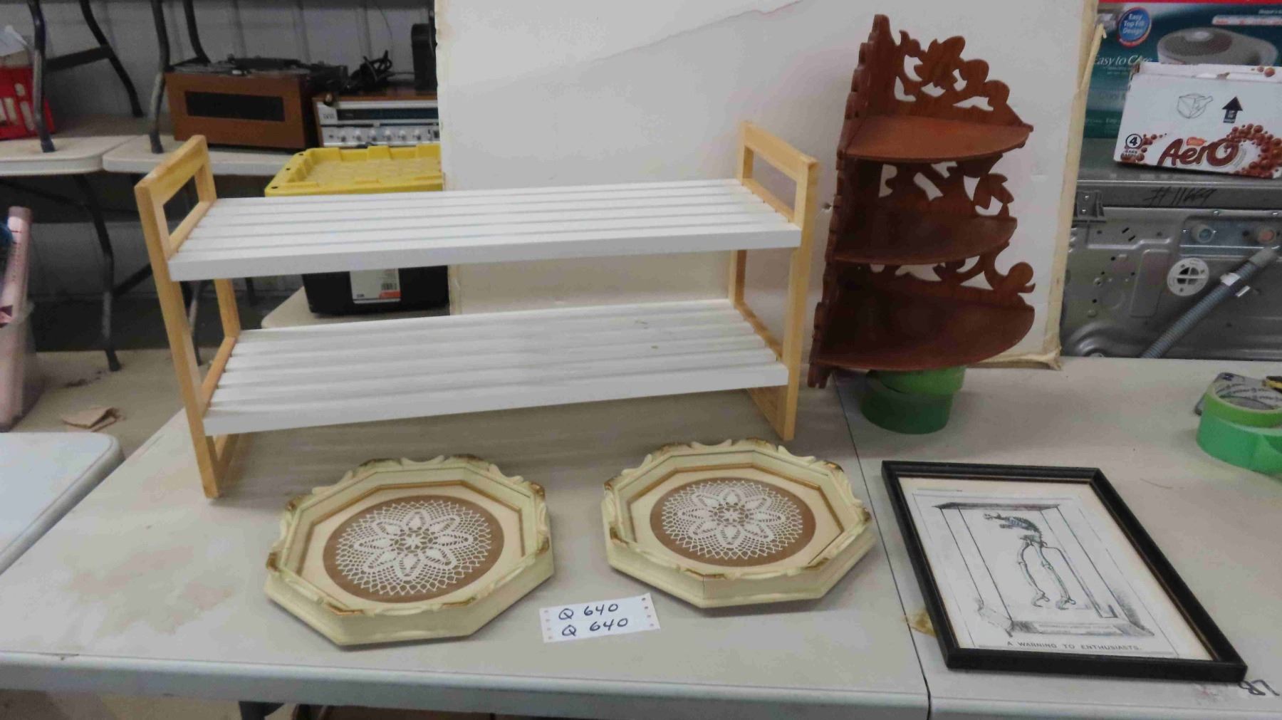 2 Tier Shelf 10"x 14" x 27.5", Decorative Wood Corner Shelf, 2 Framed Doilies