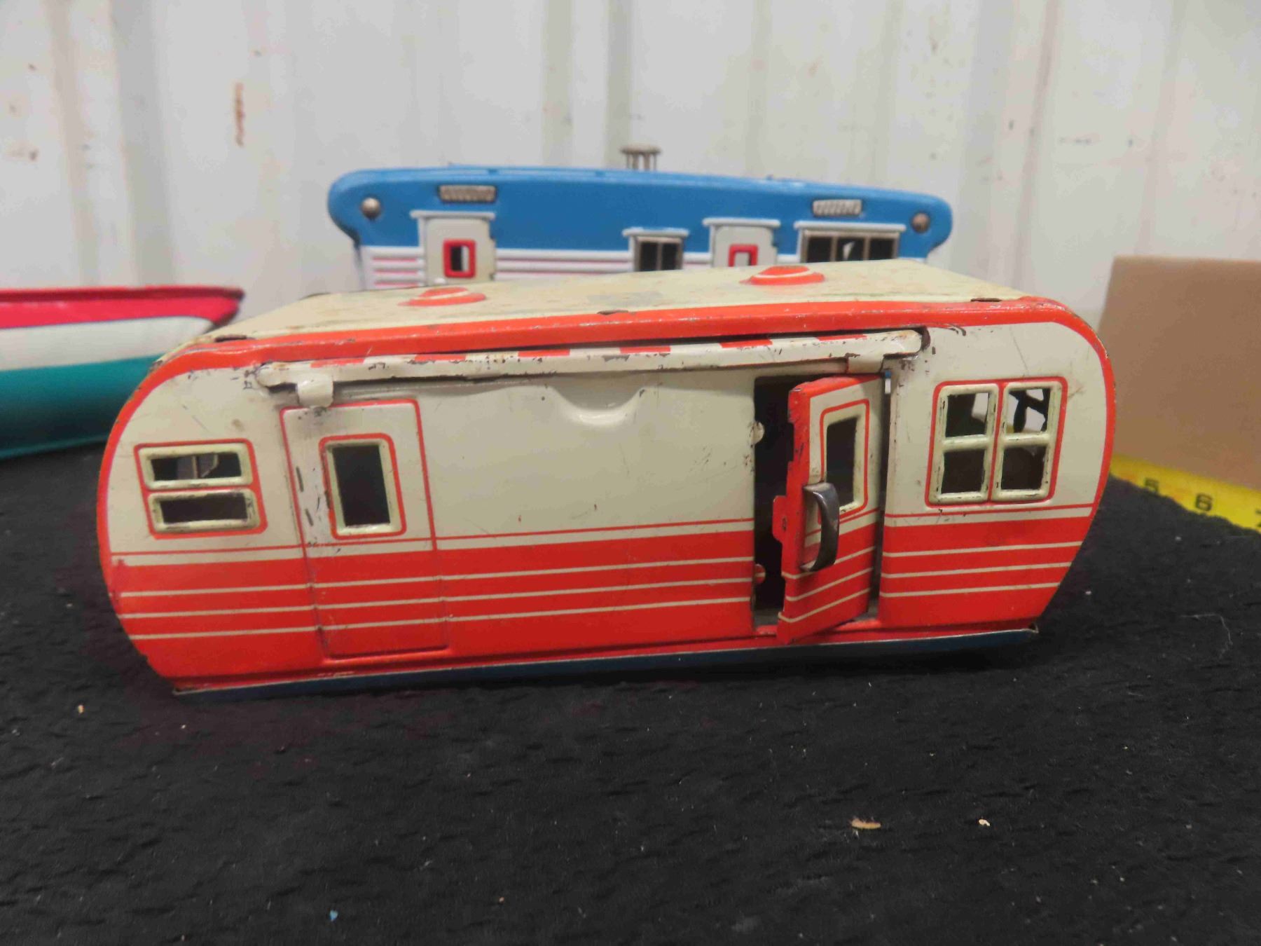 2 Tin Campers ; no makers mark 4 x 4 x 9  & 2.5  x 3  x 6  Made in Japan Boat +