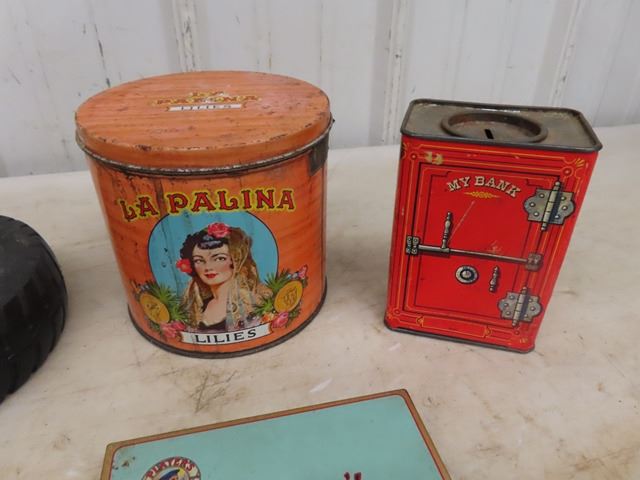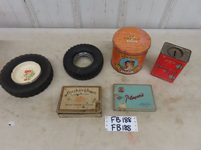 2 Tire Ashtrays - 1 is Firestone, Player's + Buckingham Cigarette Tins, La Palina Cardboard Safe Shaped Bank