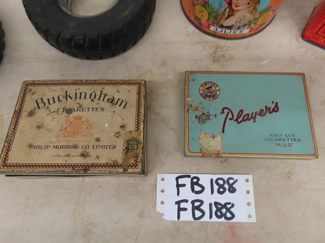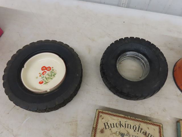 2 Tire Ashtrays - 1 is Firestone, Player's + Buckingham Cigarette Tins,