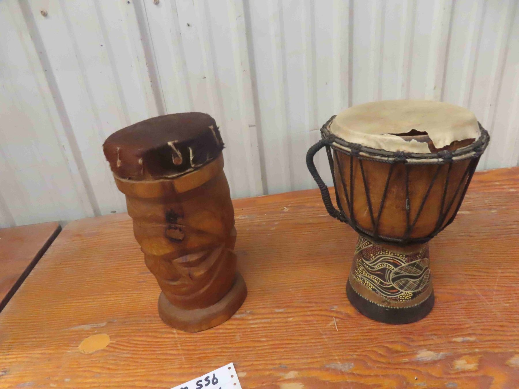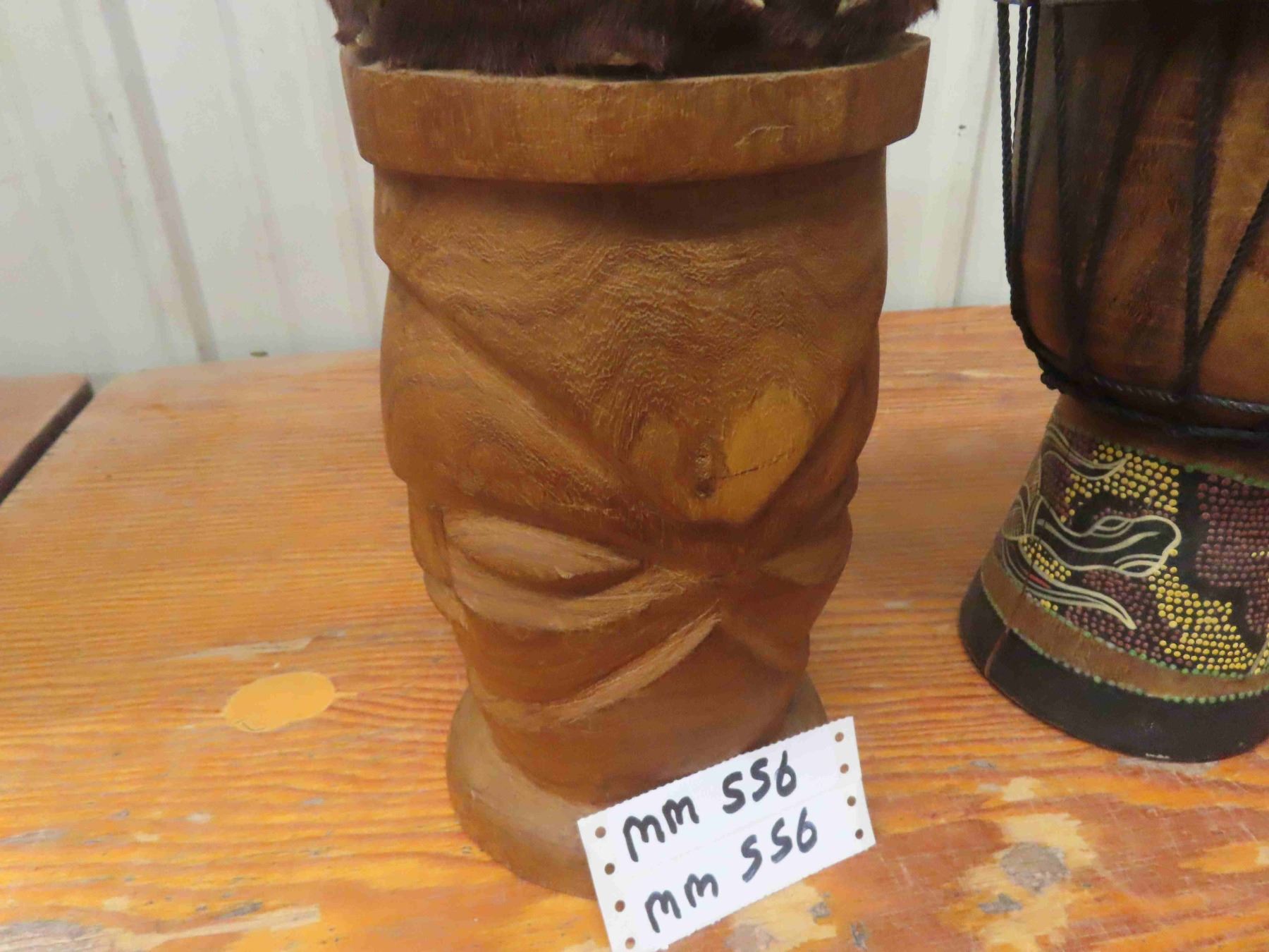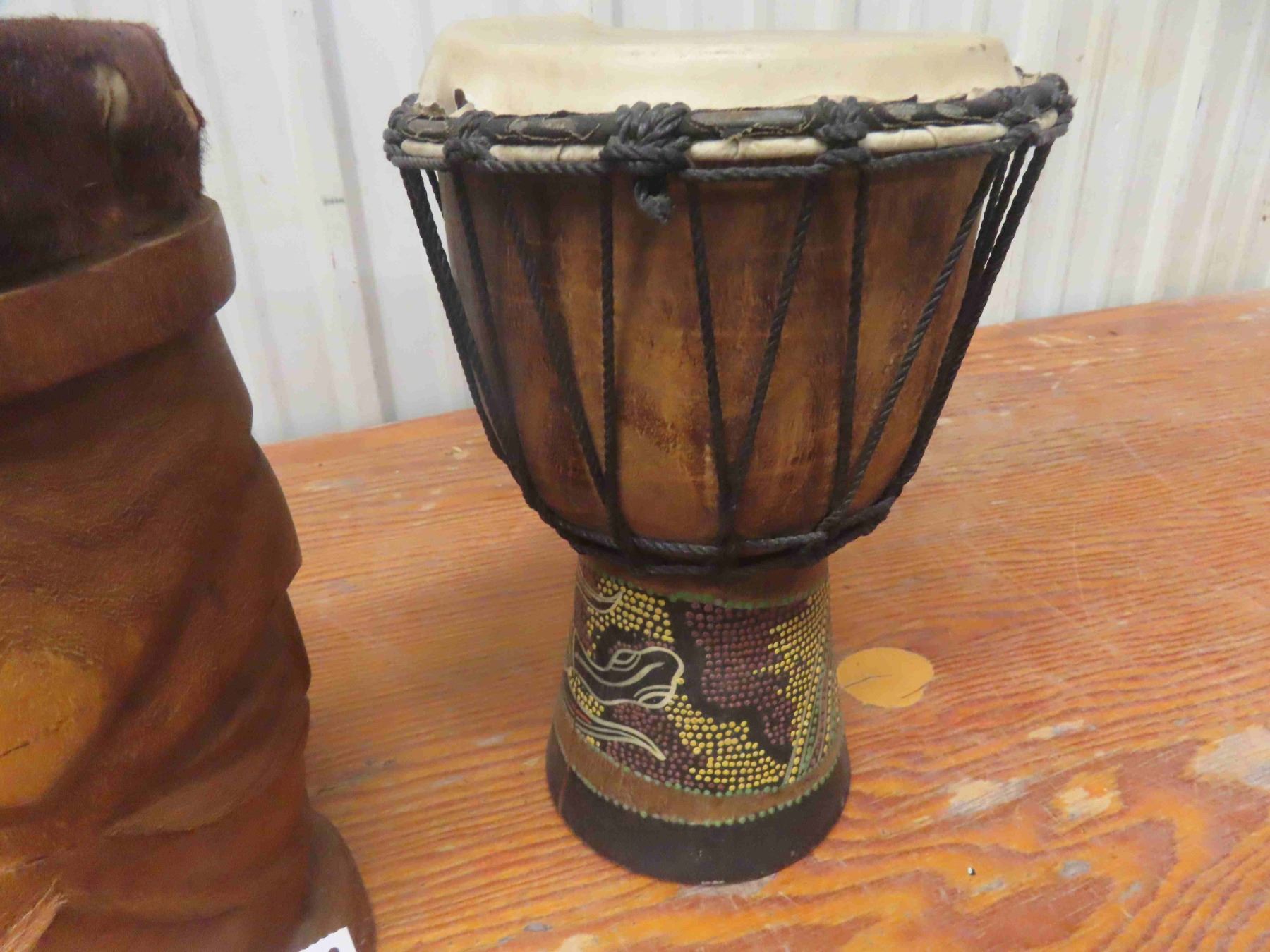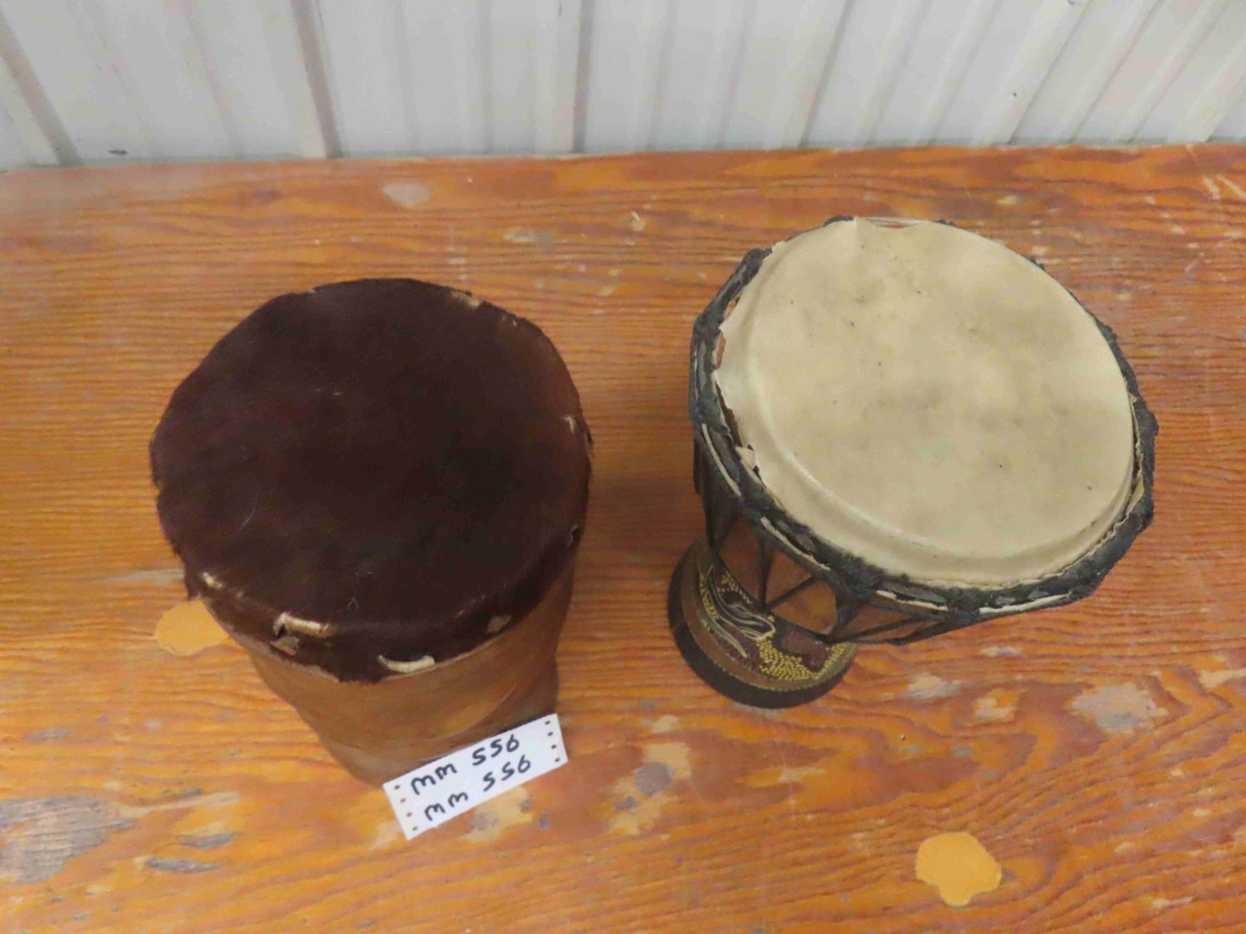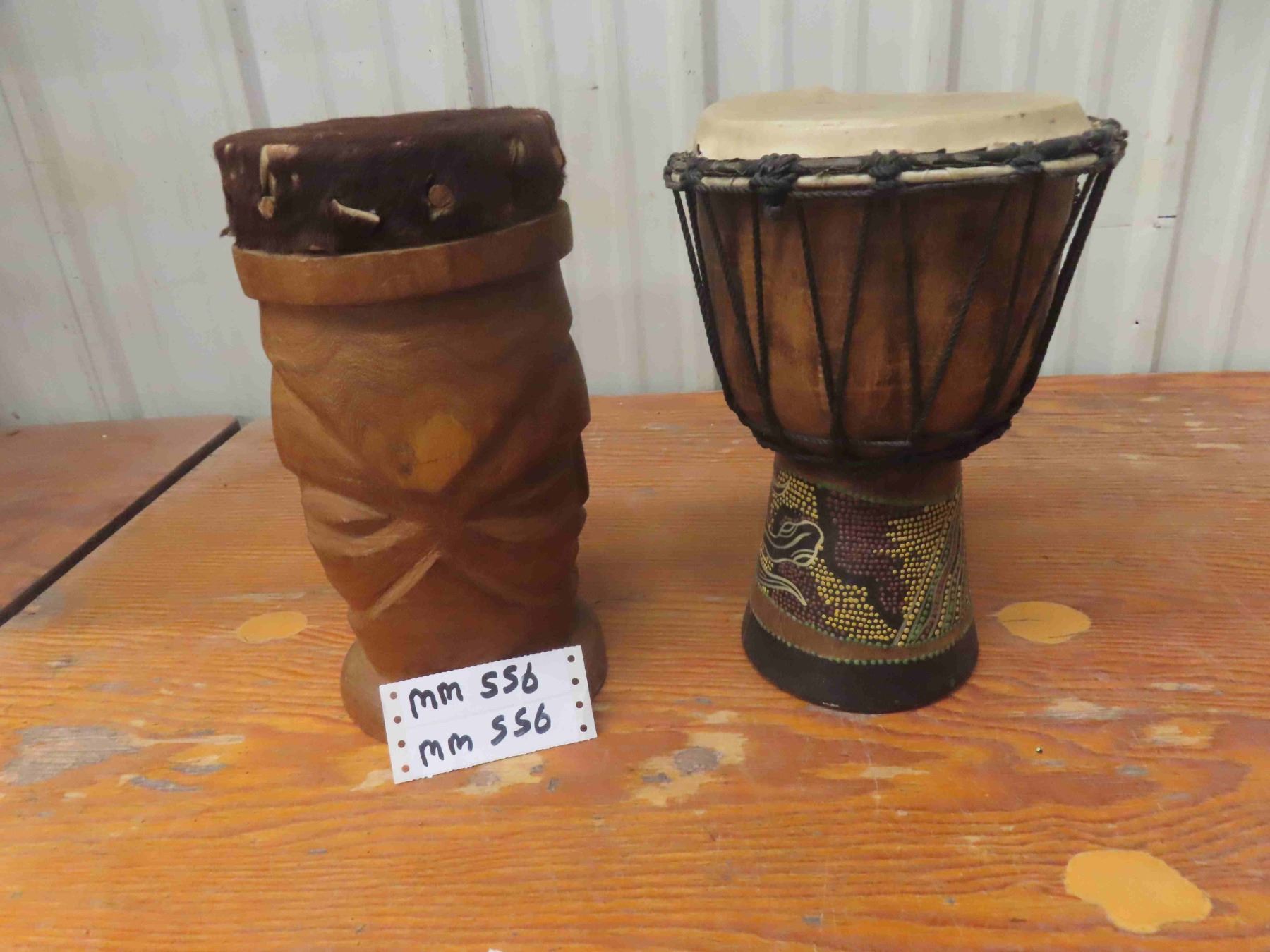 2 Tribal Carved Bongos with Hide Skin ; 6" diameter x 12" & 8" diameter x 12"