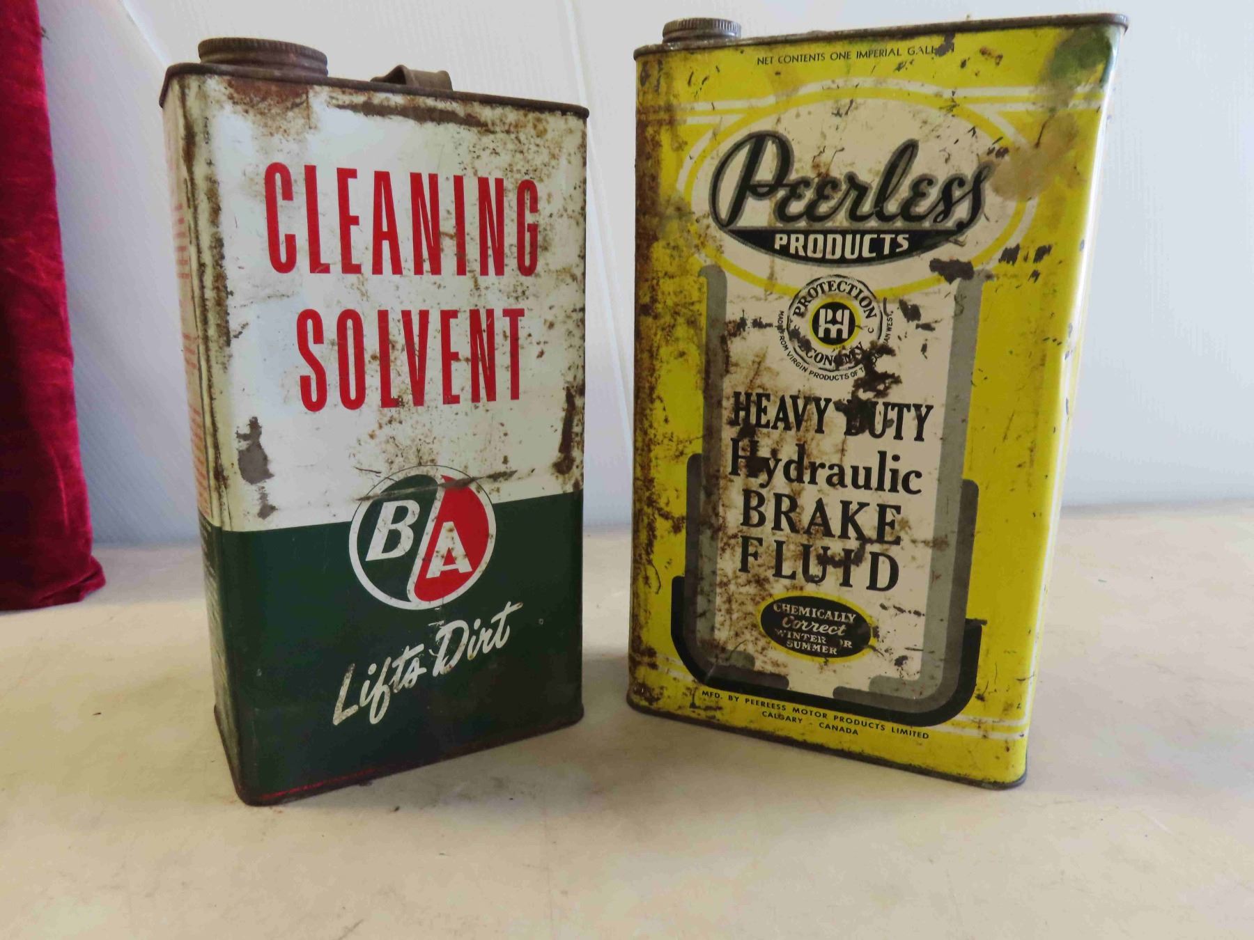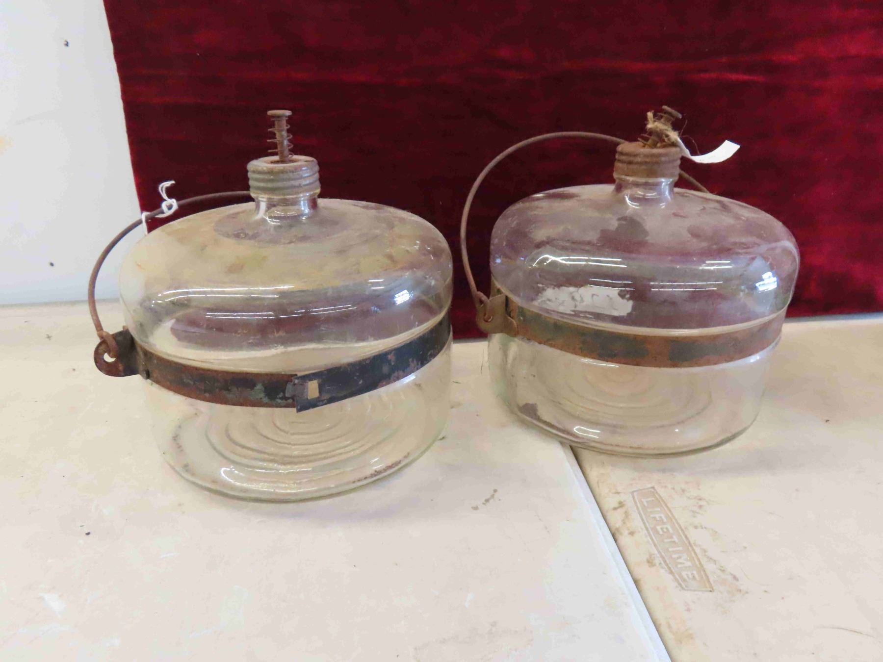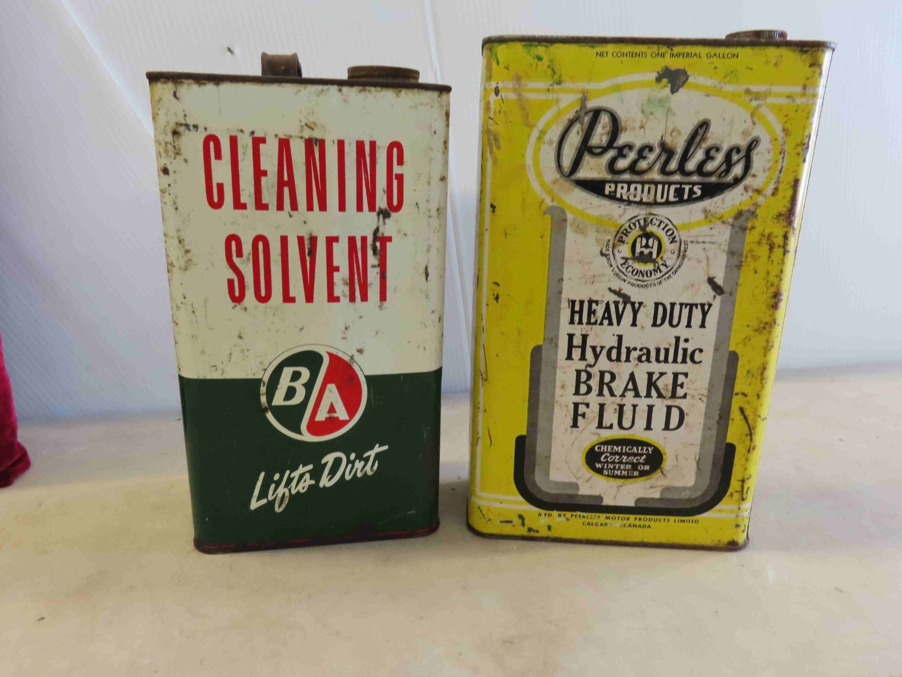 2 Vintage 1 Gallon Tins : Peerless & BA , 2 Glass Kerosene Pails