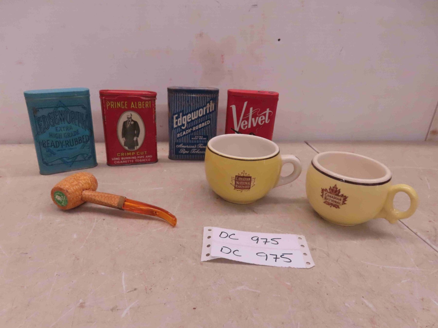 2 Vintage CNR Mugs, 4 Tobacco Tins, Edgeworth, Prince Albert, Velvet & Corn Pipe