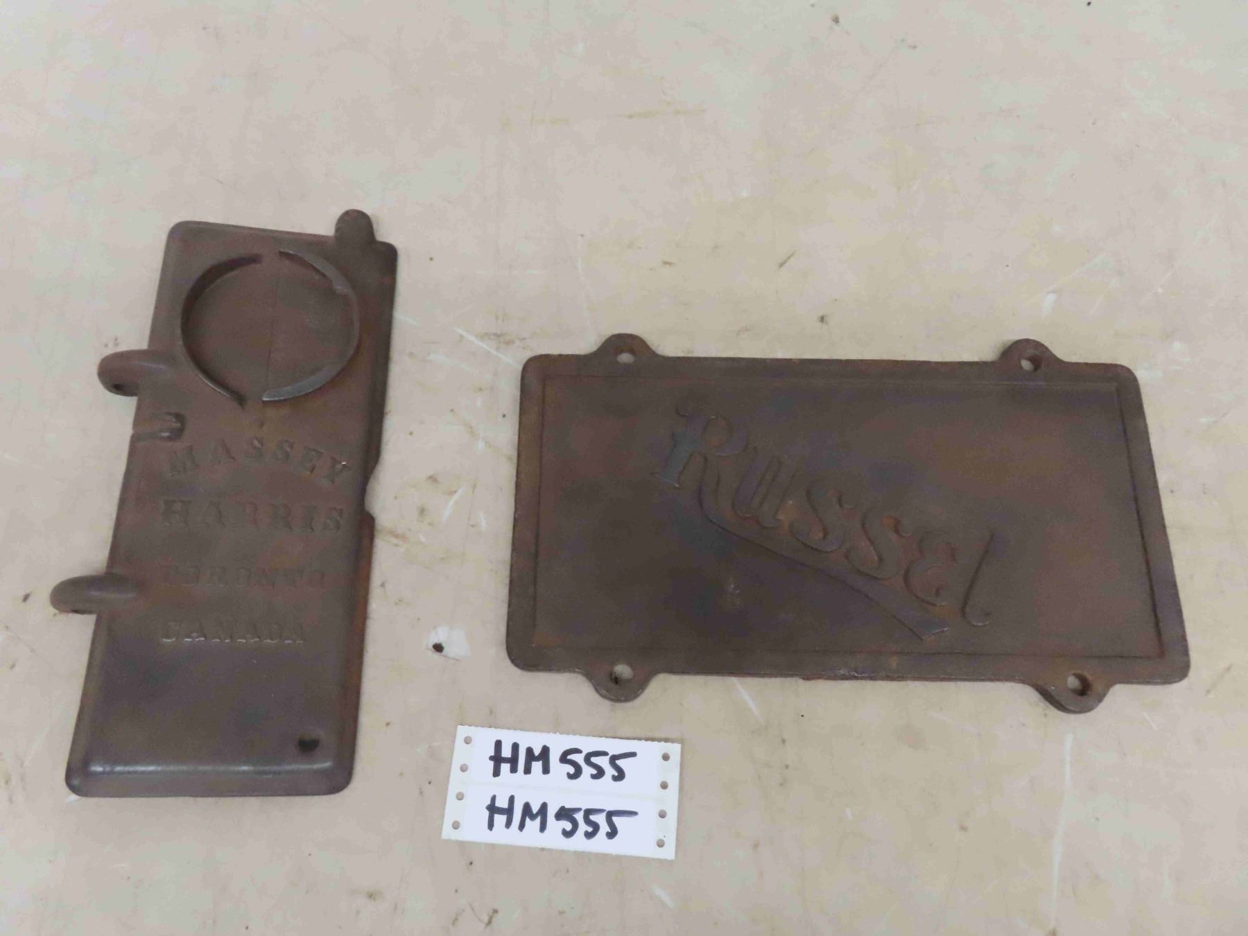 2 Vintage Cast Iron Implement Tool Box Covers ; Massey Harris, Russell