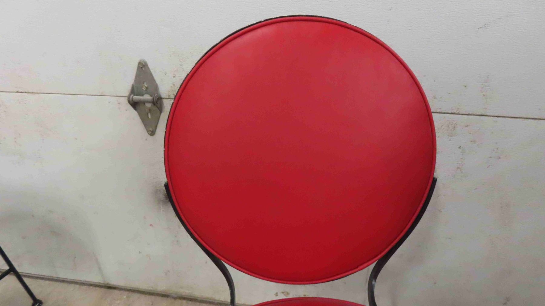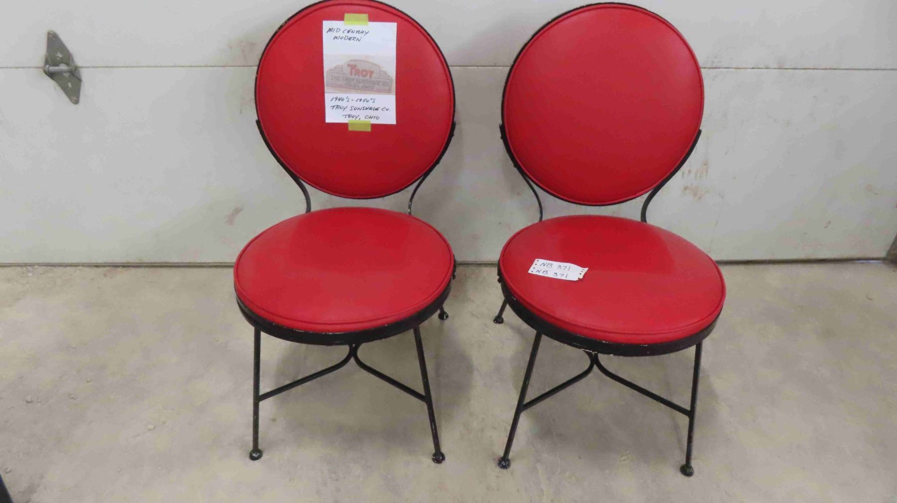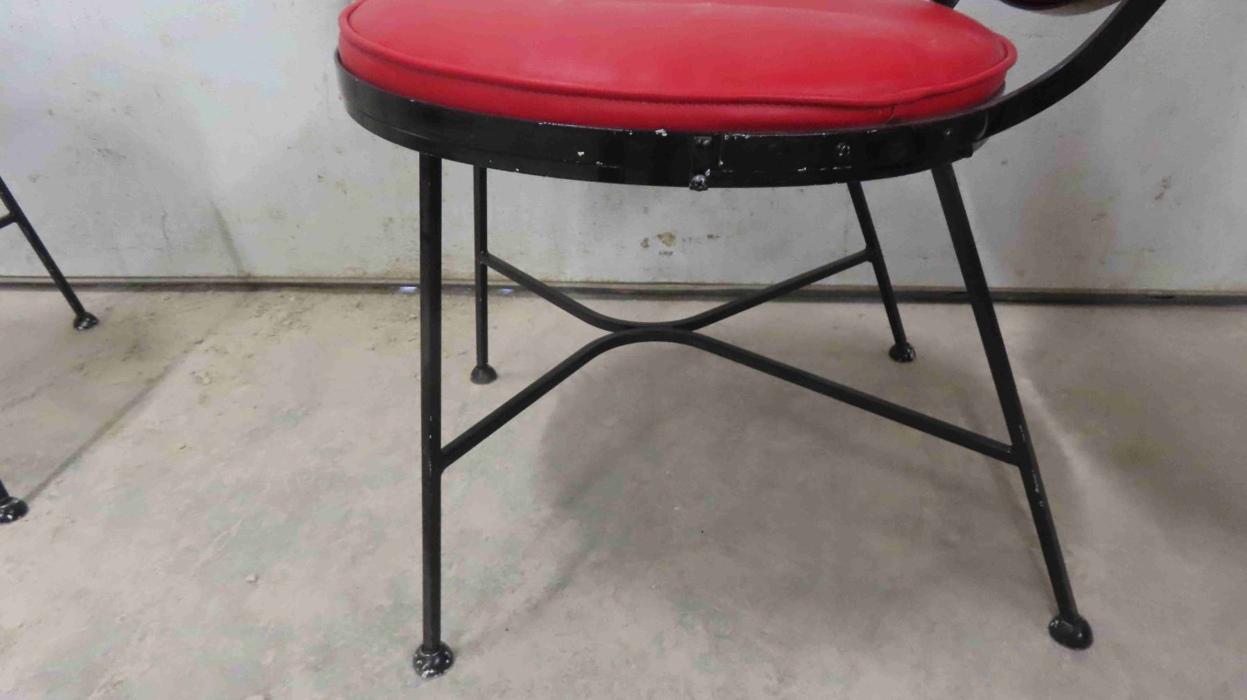 2 Vintage Chairs - Mid Century 1940-50 from Troy Sunshade Co. Wrought Iron Frame with Red Upholstered Seat + Back