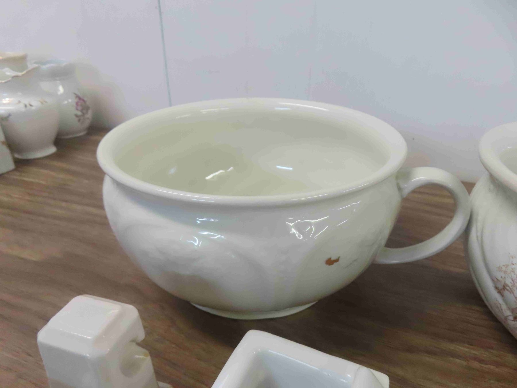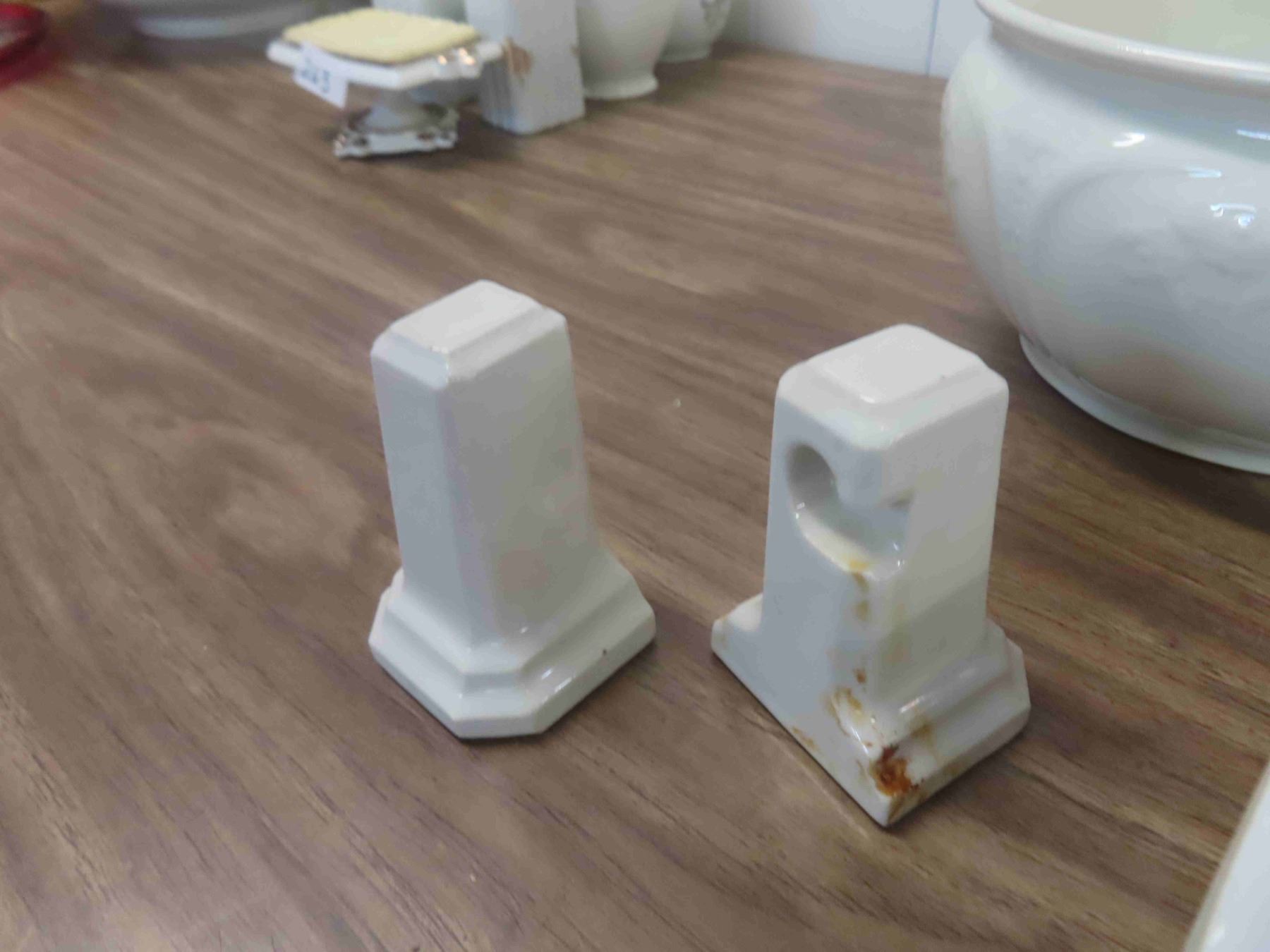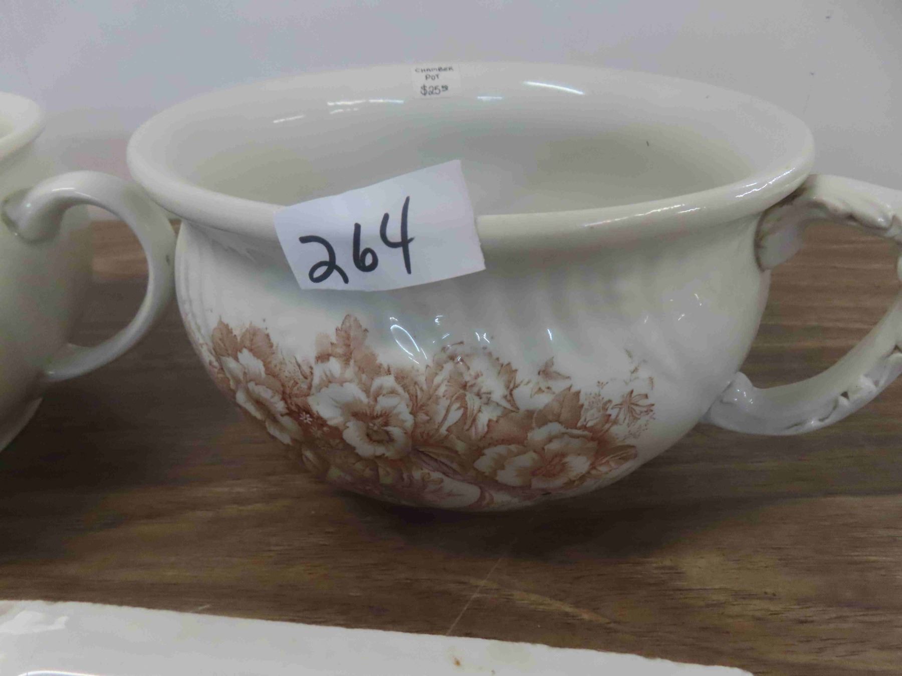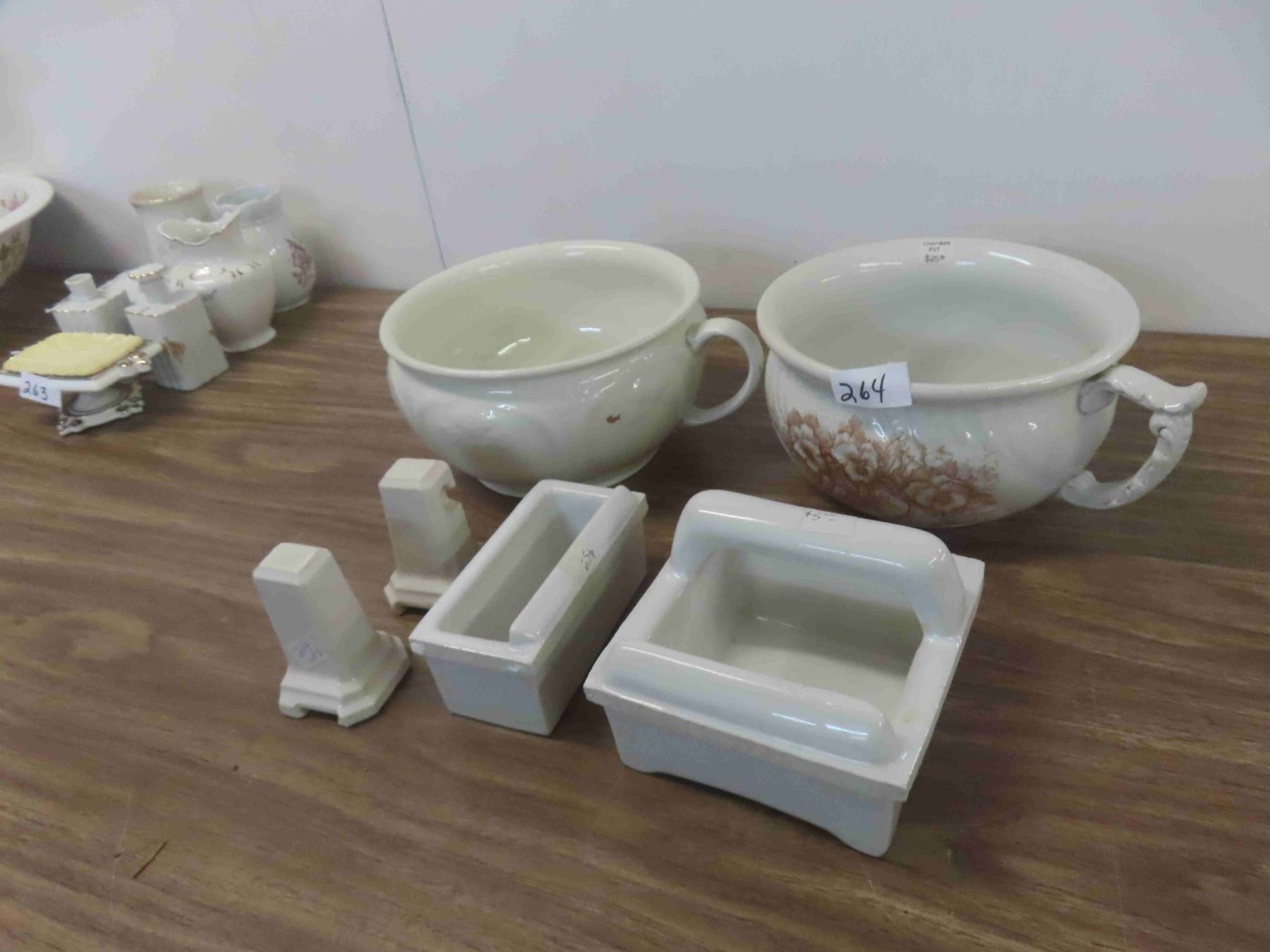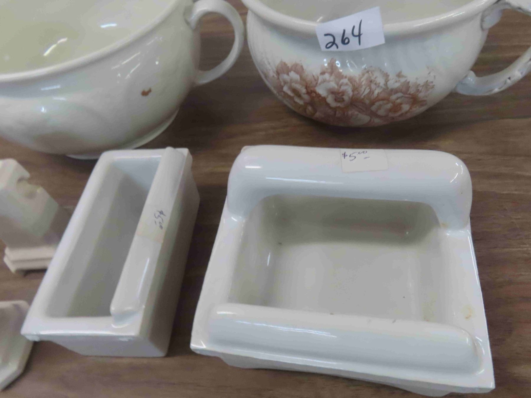2 Vintage Chamber Pots, 2 Porcelain Soap Dishes, Toilet Paper Dispenser
